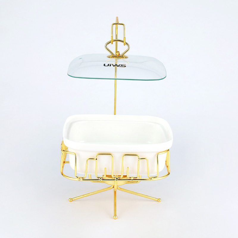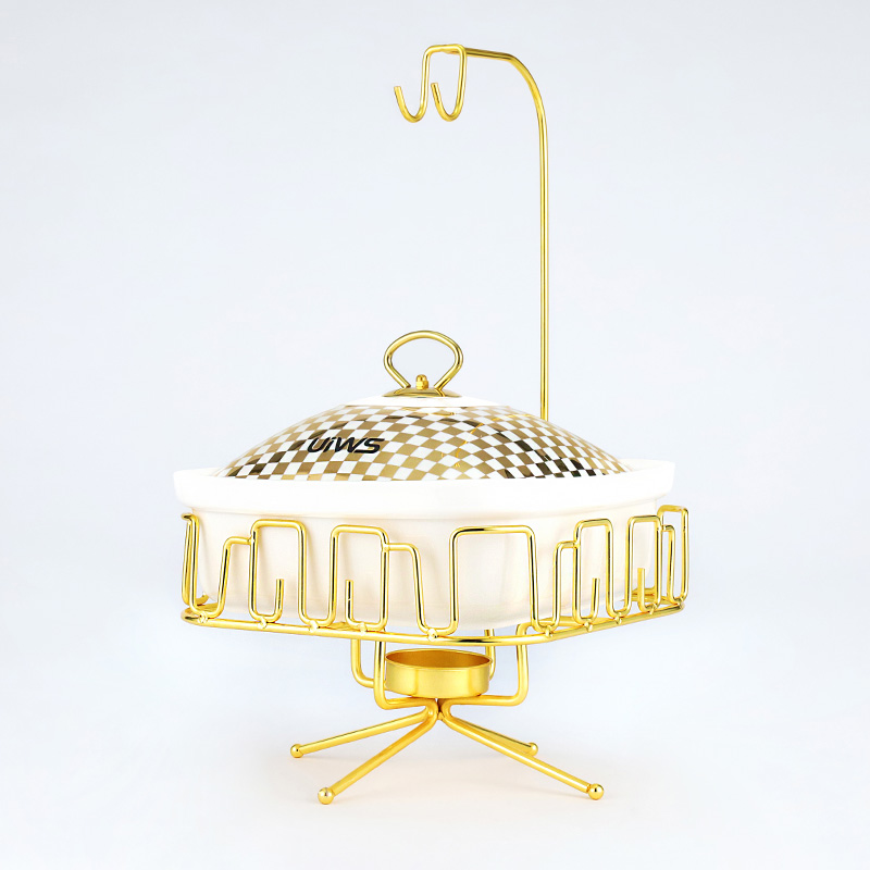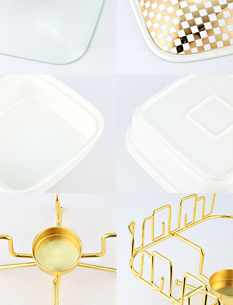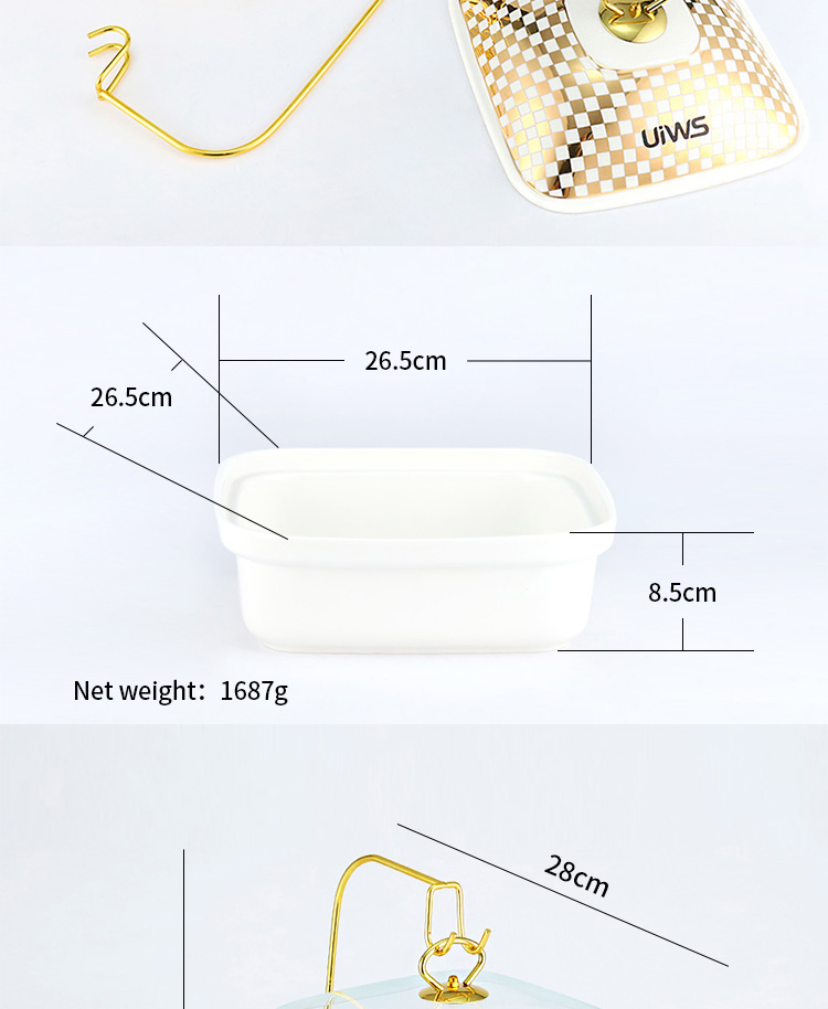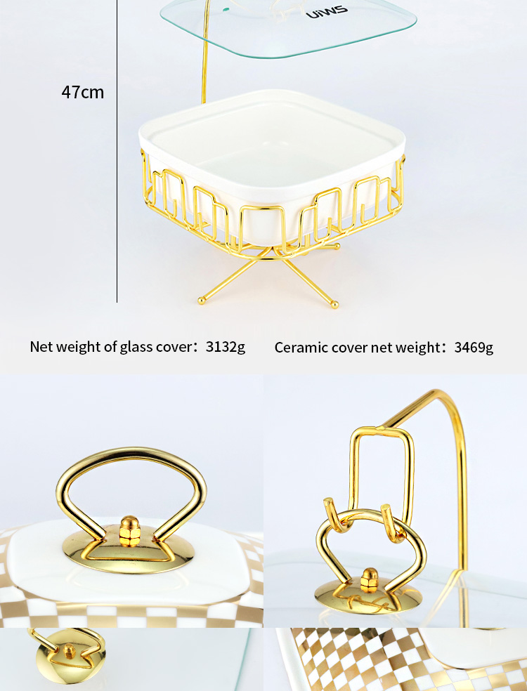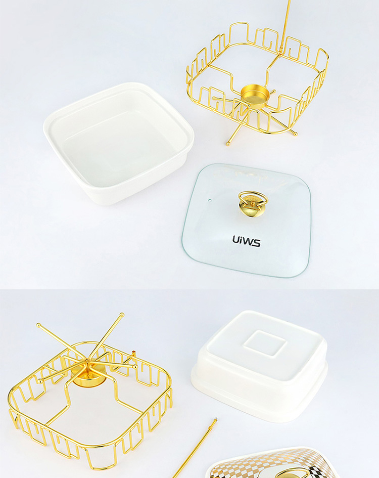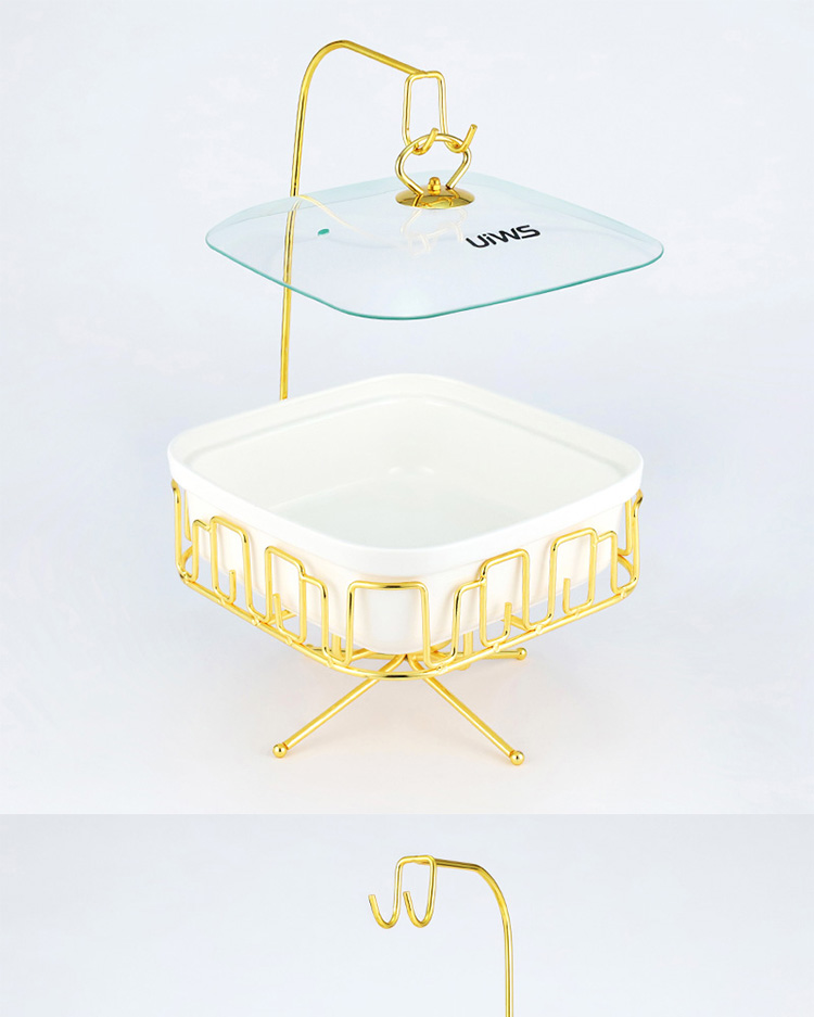 The square Chafing dish comes with a hook, and the lid has two options: glass and ceramic, showcasing a luxurious and luxurious style
