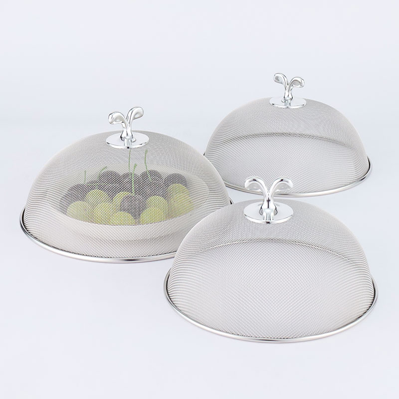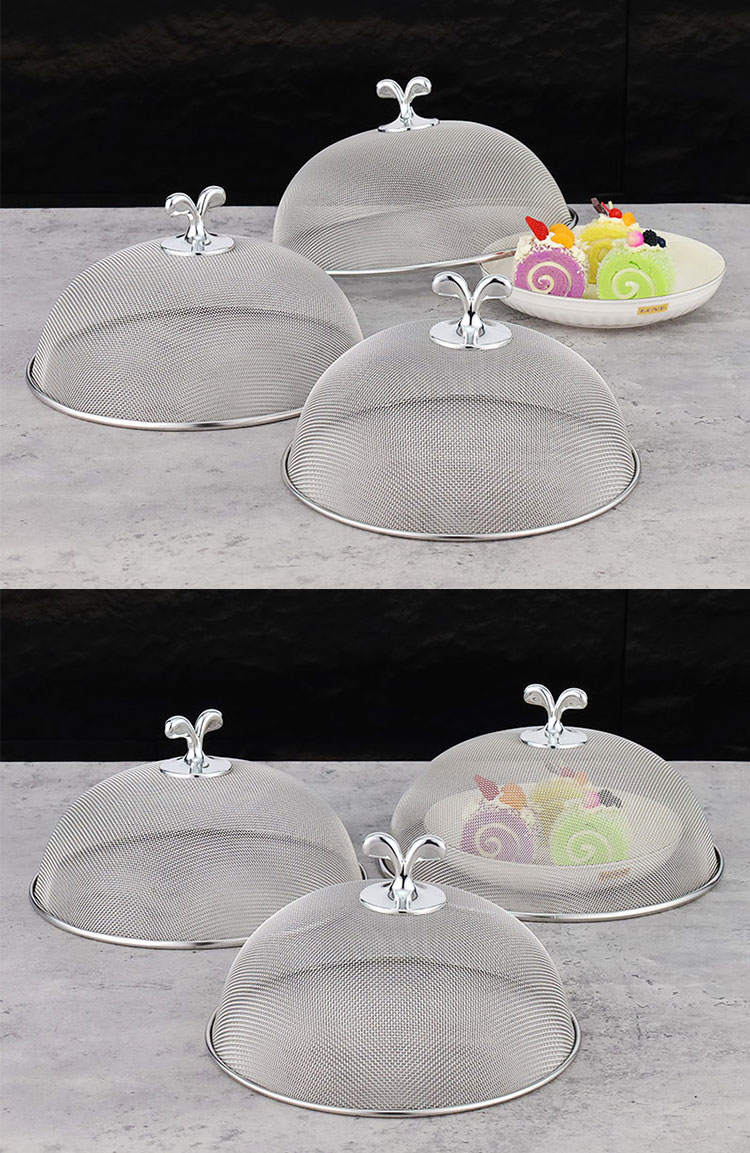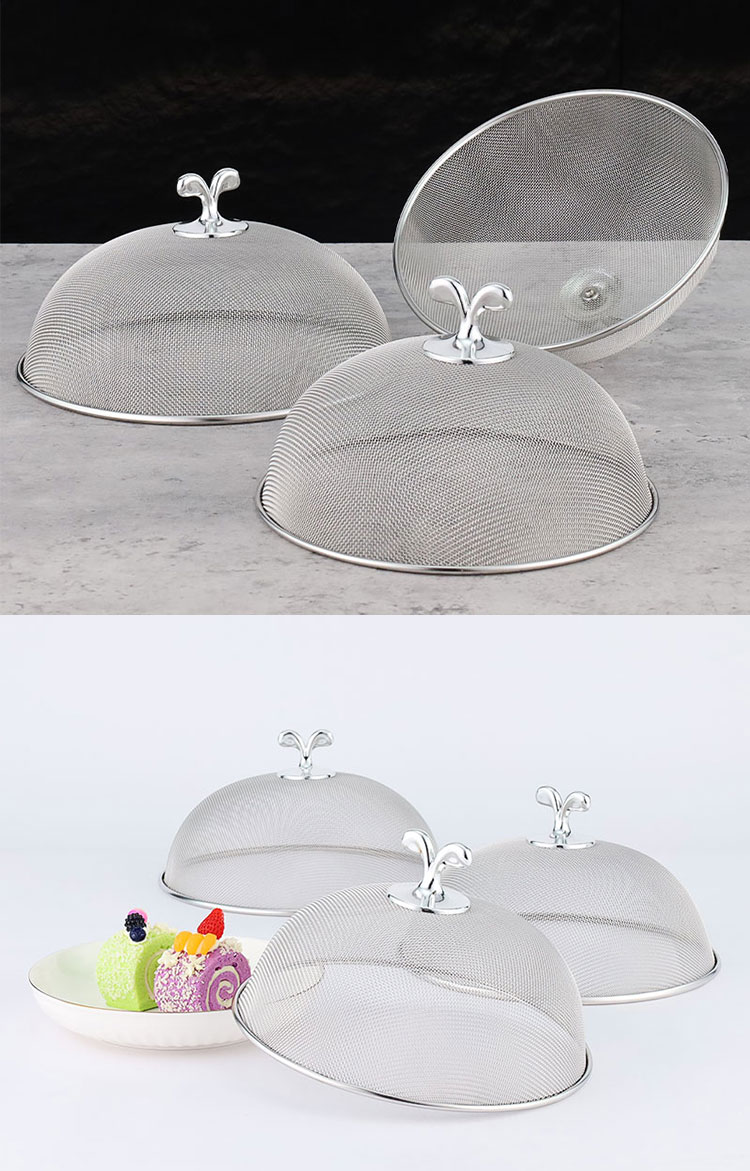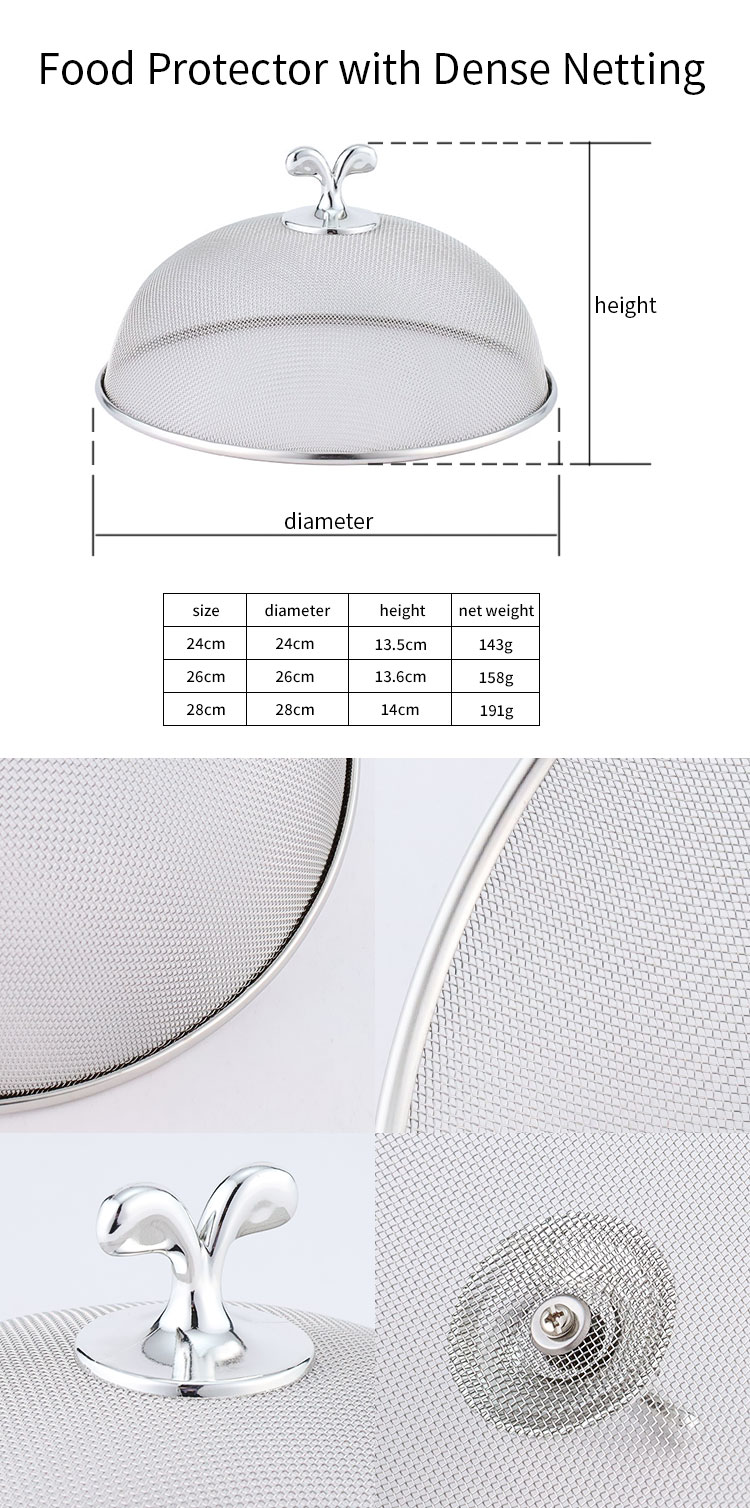 The dense mesh vegetable cover is made of stainless steel material and comes in three sizes: 24cm, 26cm, and 28cm. It is designed with a handle for easy access. The surface of the product is made of hollow wire mesh, which is breathable, fly proof, and has fine mesh. It is sturdy and durable, with rolled edges that are not easy to scratch and are easy to clean