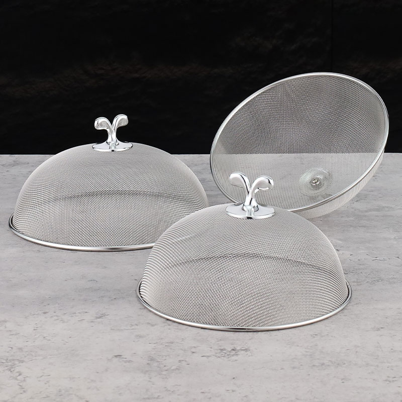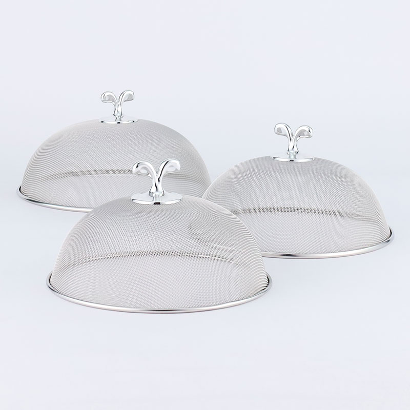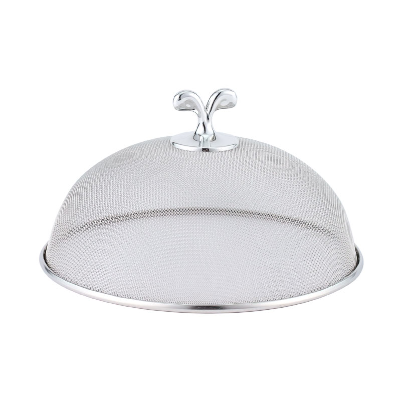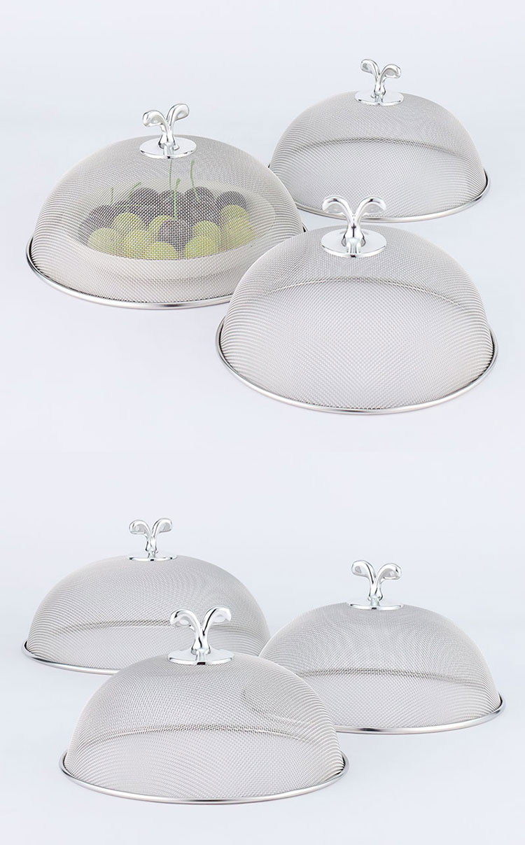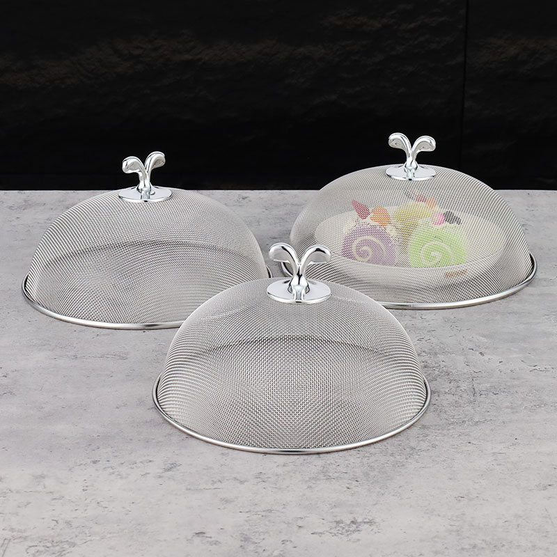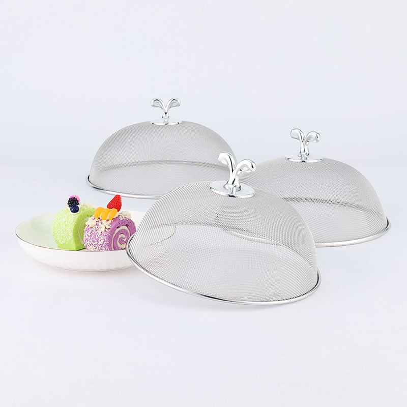 The dense mesh vegetable cover is made of stainless steel material and comes in three sizes: 24cm, 26cm, and 28cm. It is designed with a handle for easy access. The surface of the product is made of hollow wire mesh, which is breathable, fly proof, and has fine mesh. It is sturdy and durable, with rolled edges that are not easy to scratch and are easy to clean