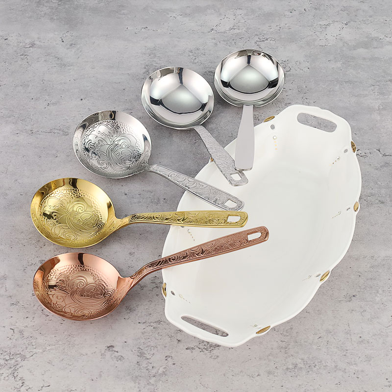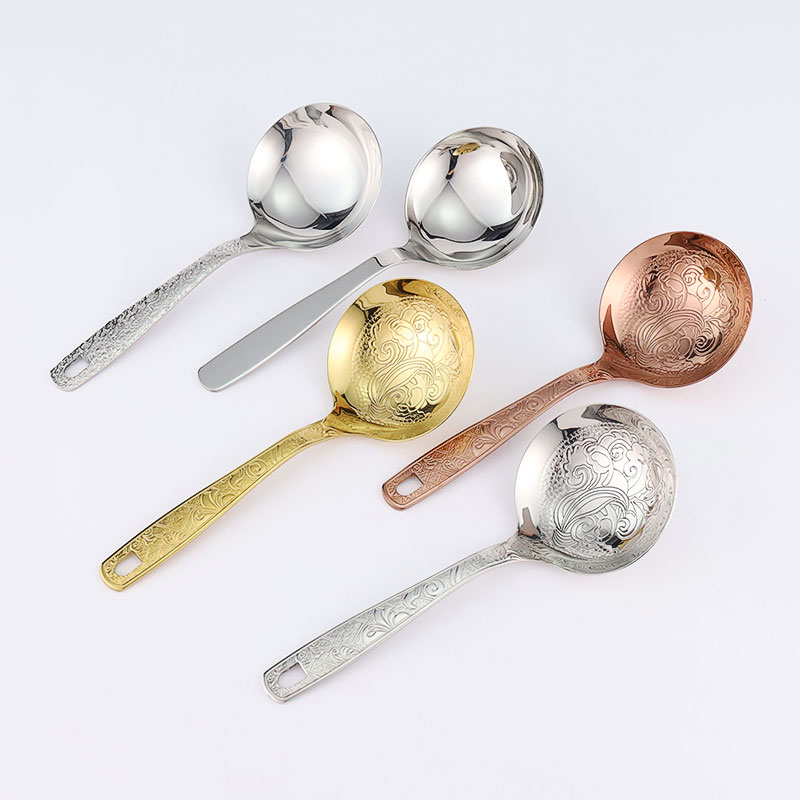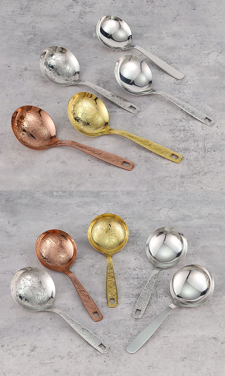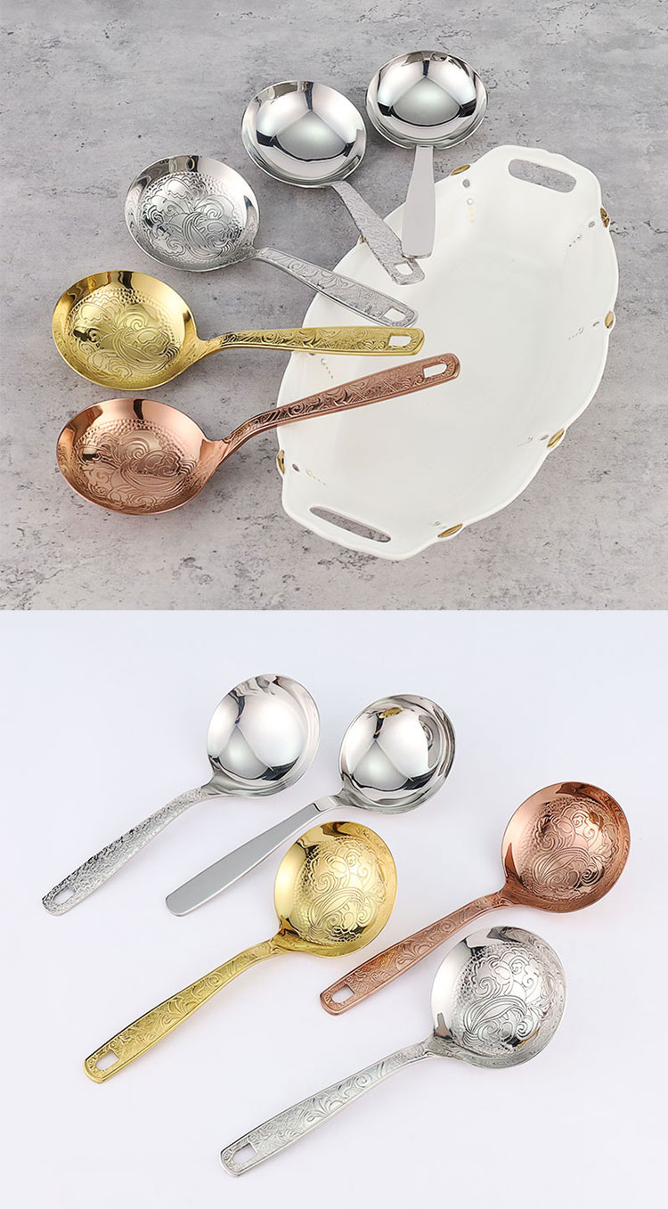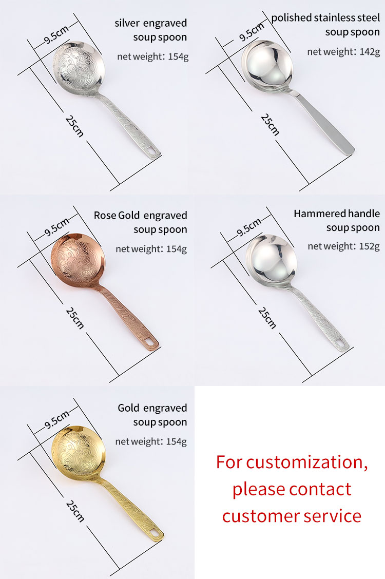 The soup spoon is made of stainless steel and comes in gold, rose gold, silver carved spoons, as well as hammer patterned handle spoons. The smooth stainless steel soup spoon features an elegant carved design and thick material, making it sturdy and durable. The hammer patterned handle has a light luxury texture and is molded in one piece, providing a comfortable grip.