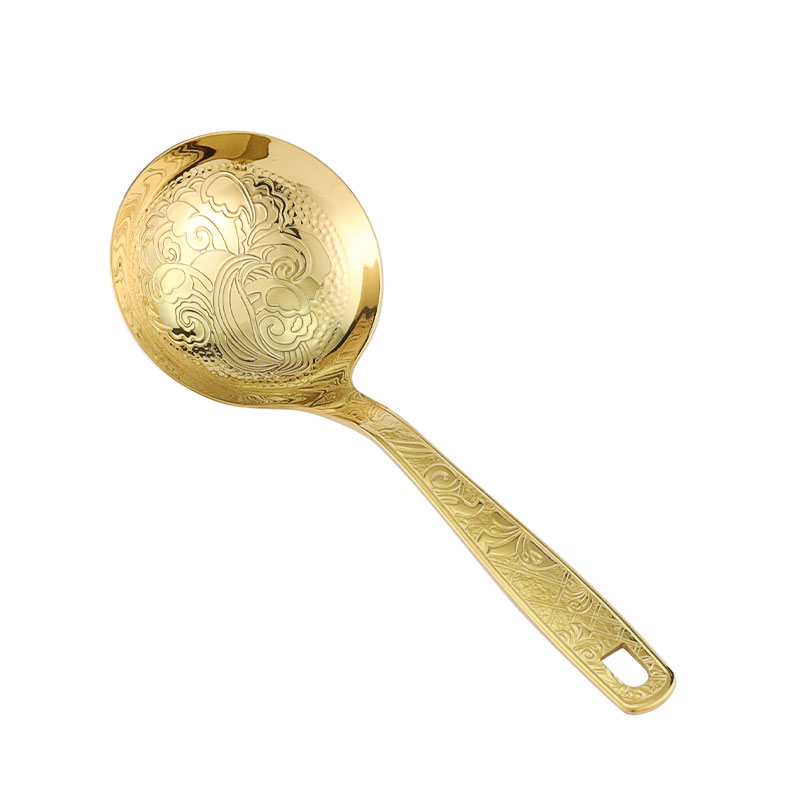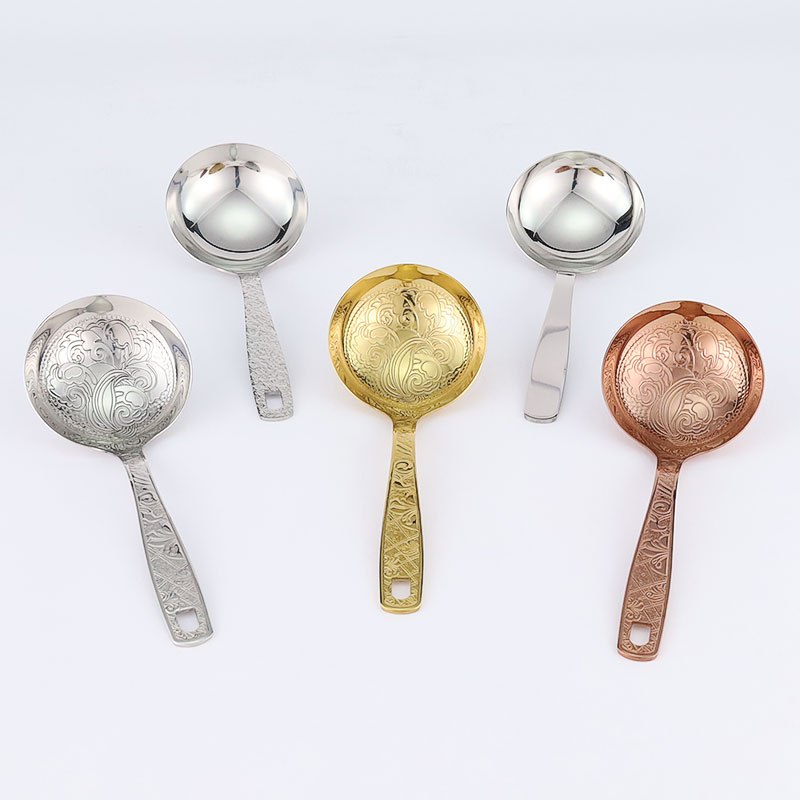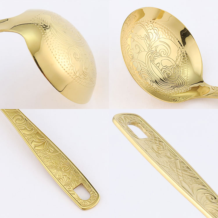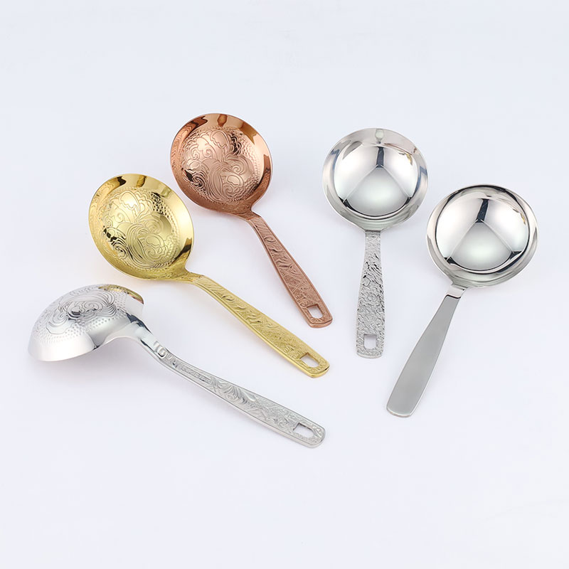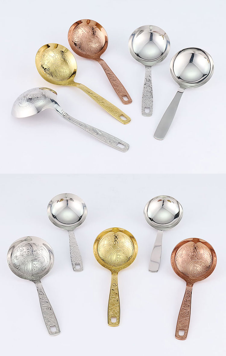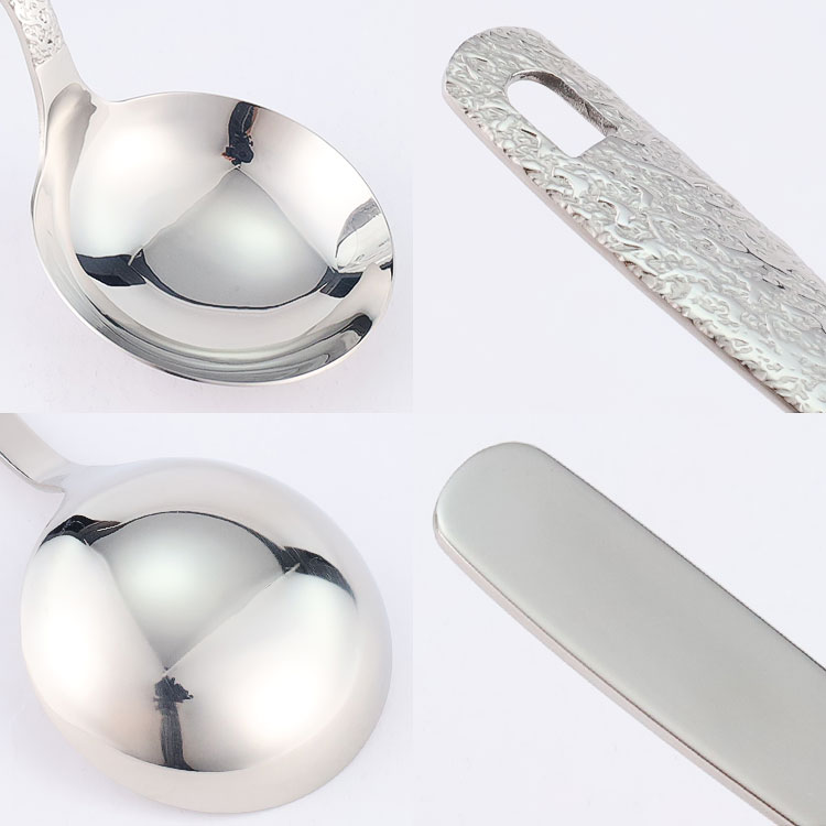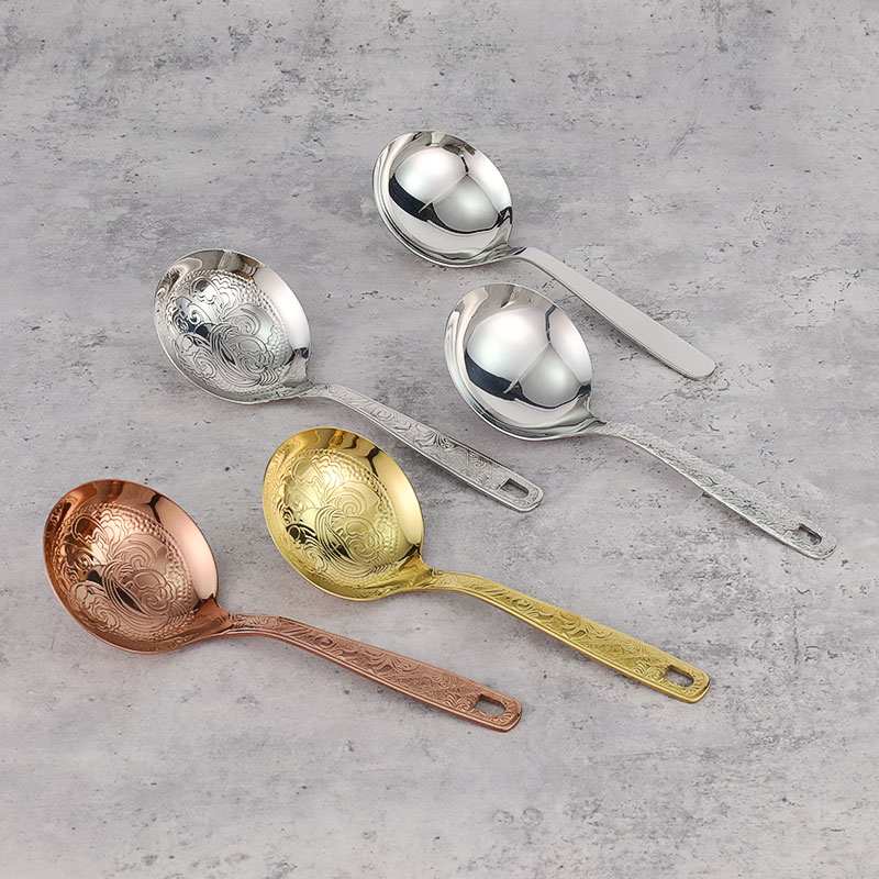 The soup spoon is made of stainless steel and comes in gold, rose gold, silver carved spoons, as well as hammer patterned handle spoons. The smooth stainless steel soup spoon features an elegant carved design and thick material, making it sturdy and durable. The hammer patterned handle has a light luxury texture and is molded in one piece, providing a comfortable grip.