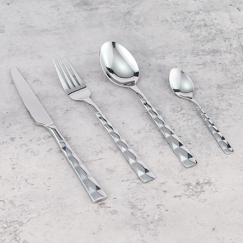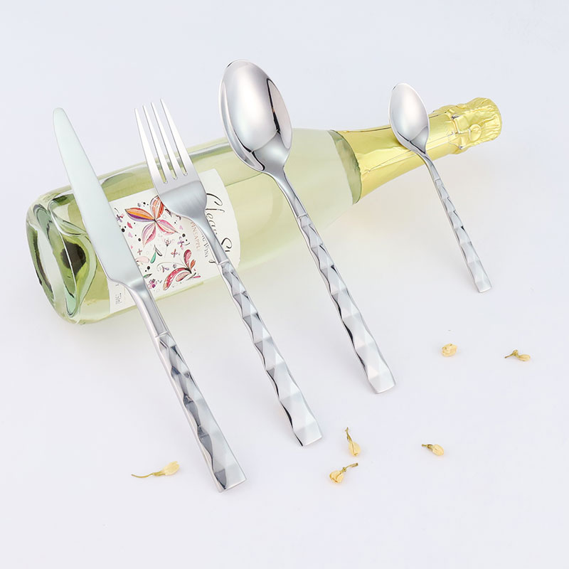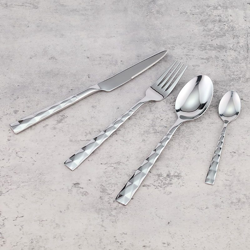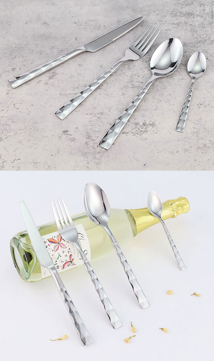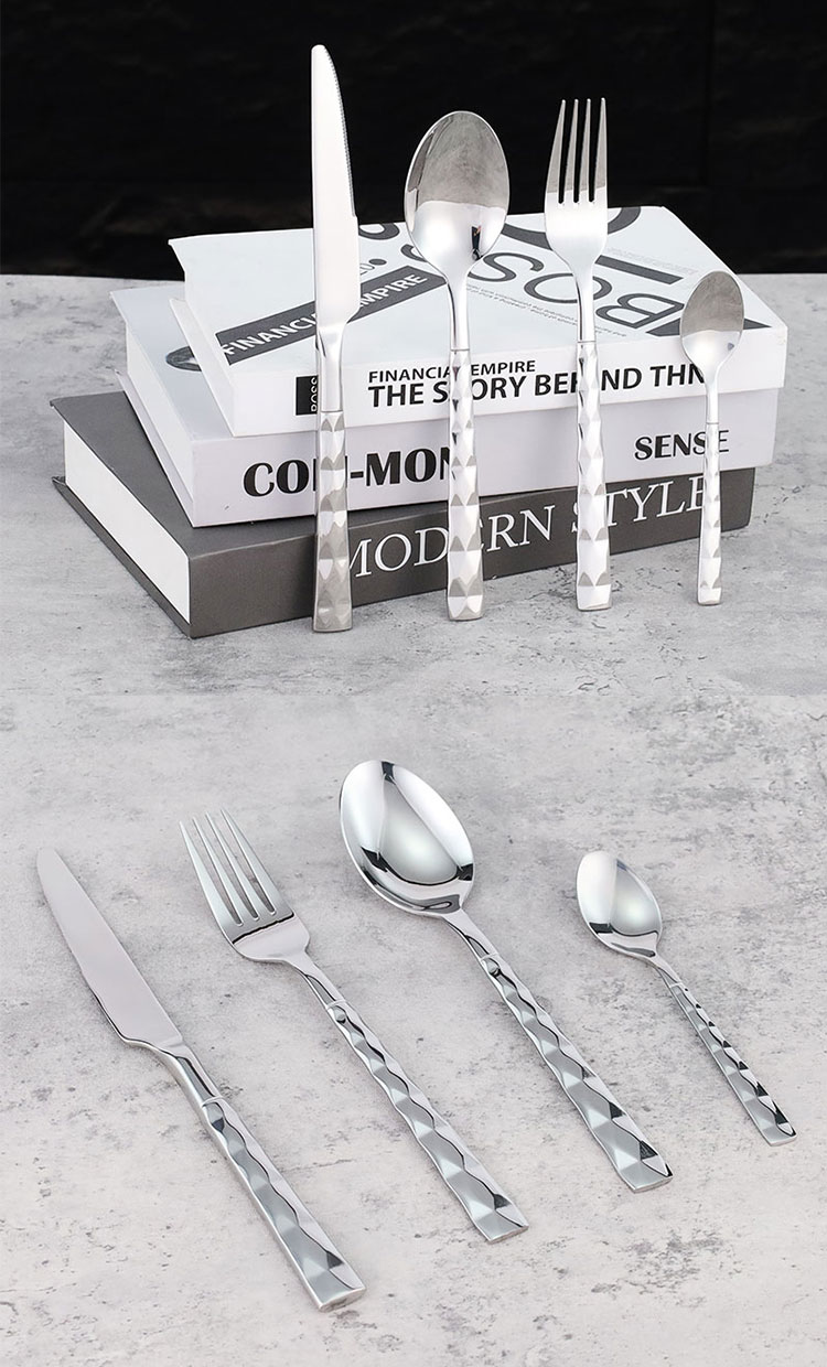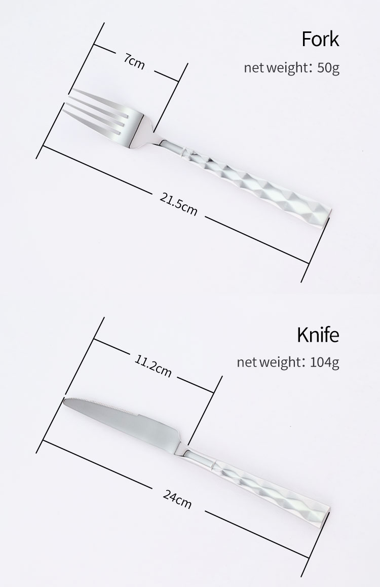 The diamond patterned knife, fork, and spoon set is made of stainless steel material and features a diamond patterned relief handle. It is exquisite and beautiful, with mirror polishing technology. The dining knife with serrated edges is more durable, not easy to cut, sturdy and durable, and easy to clean