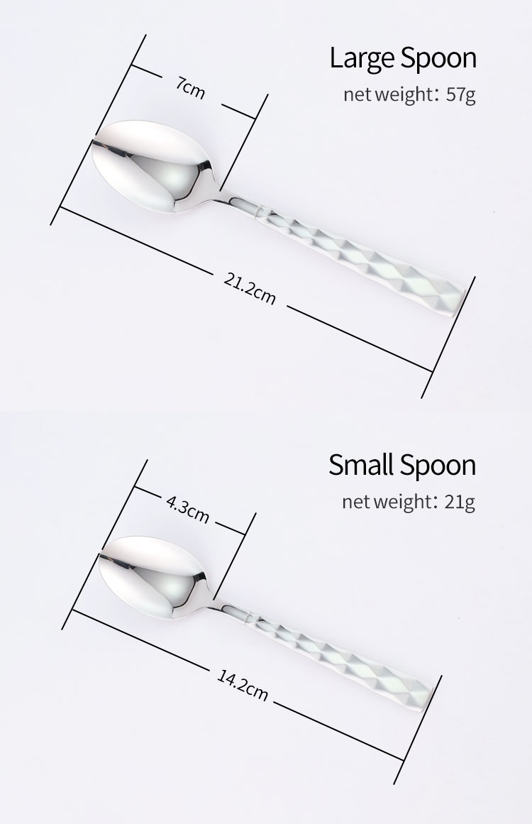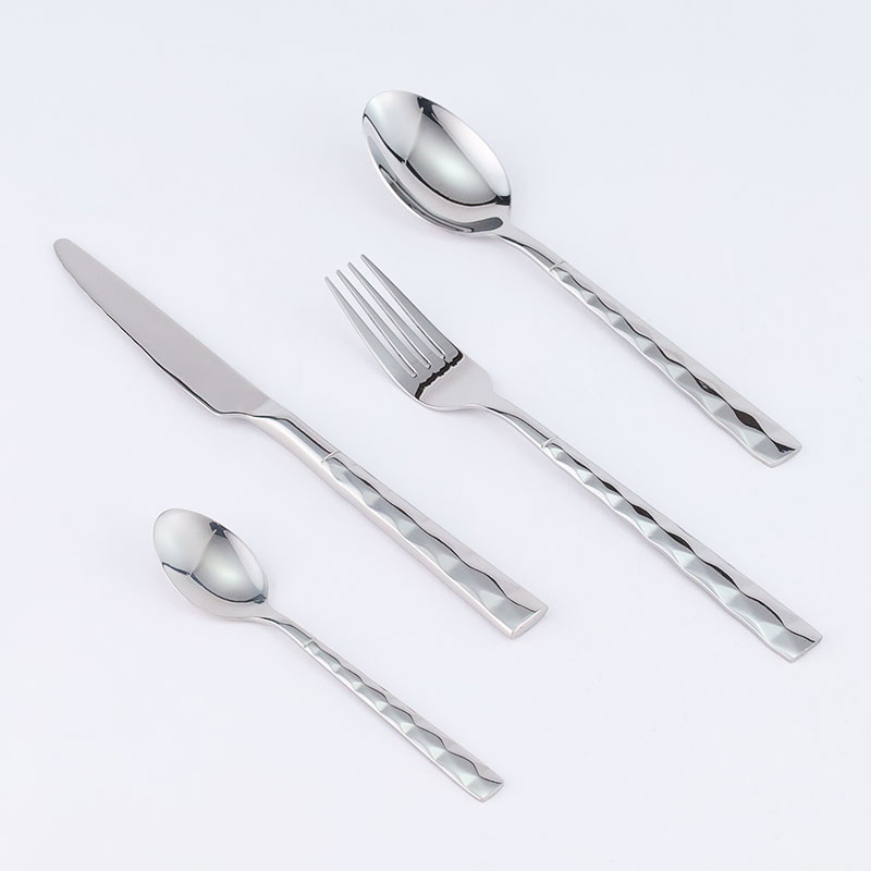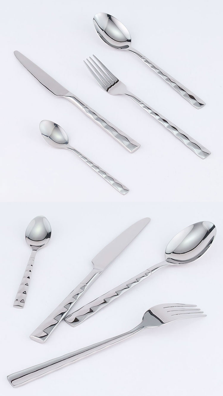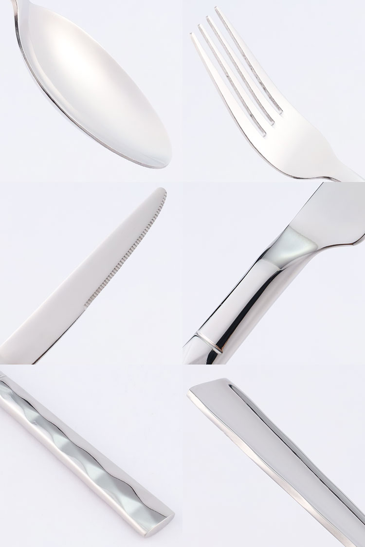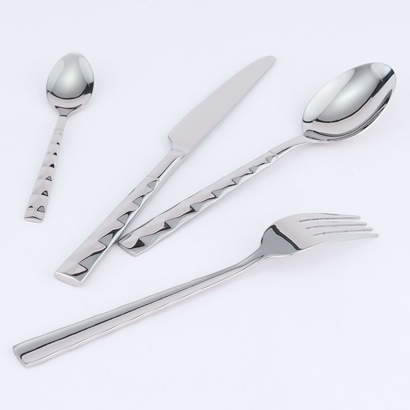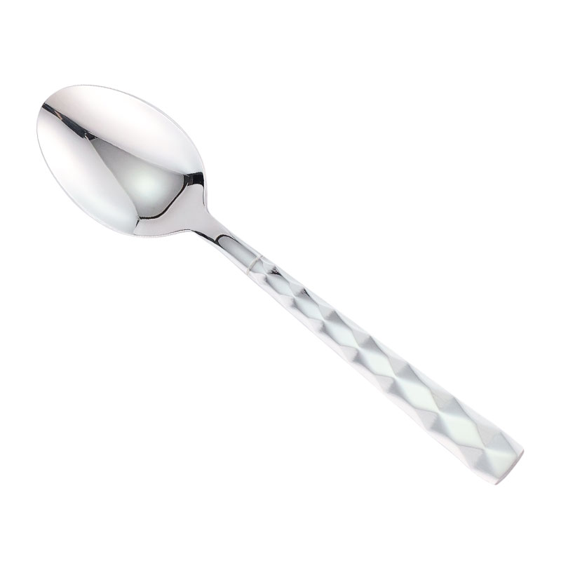 The diamond patterned knife, fork, and spoon set is made of stainless steel material and features a diamond patterned relief handle. It is exquisite and beautiful, with mirror polishing technology. The dining knife with serrated edges is more durable, not easy to cut, sturdy and durable, and easy to clean