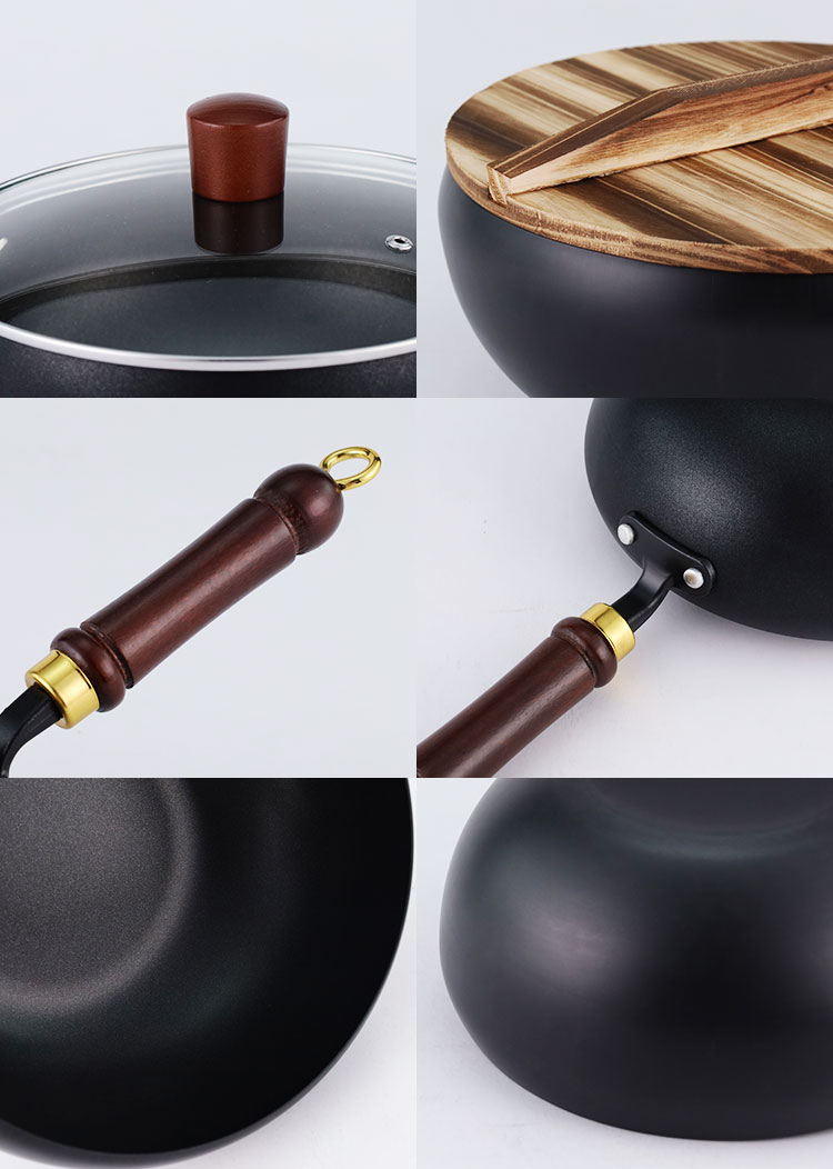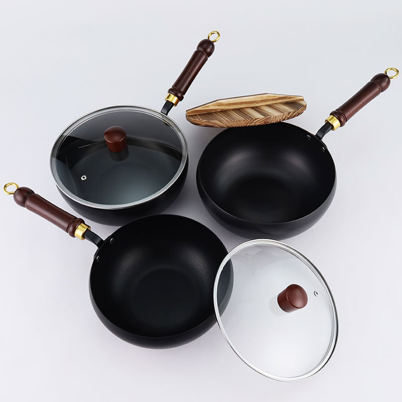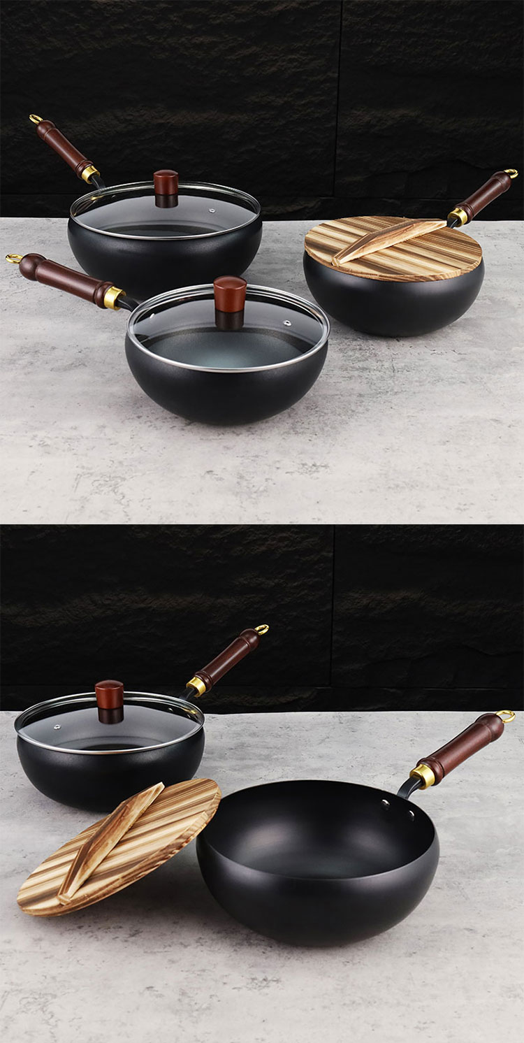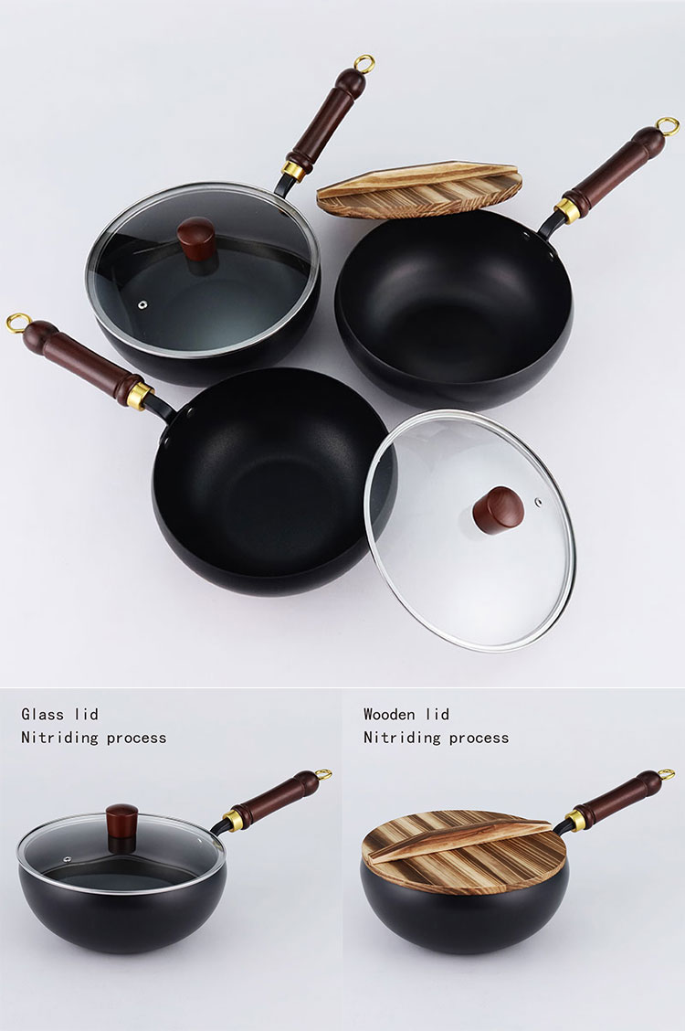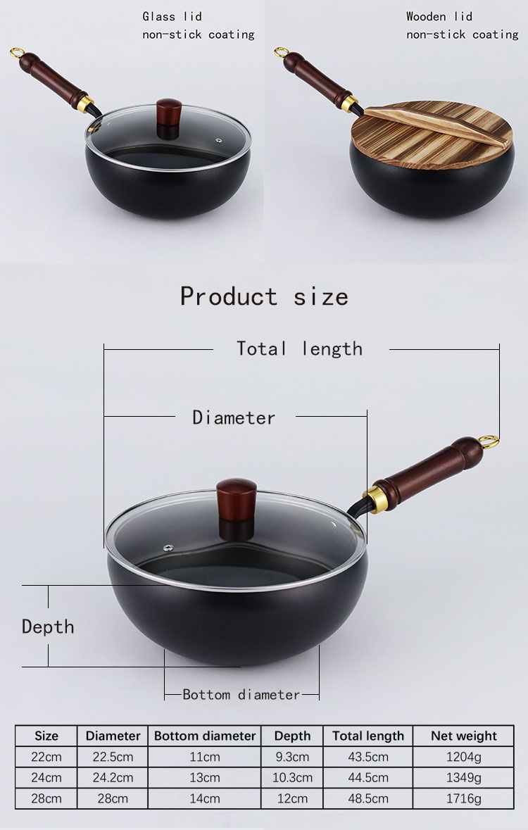 Refined iron belly pot, available in three sizes of 22cm, 24cm, and 28cm, with two processes: non stick coating and nitriding. It comes with a solid wood handle, smooth edges on the pot body, and is compatible with gas stoves and induction cookers. The bottom is flat and comes with two options: glass cover and wooden cover