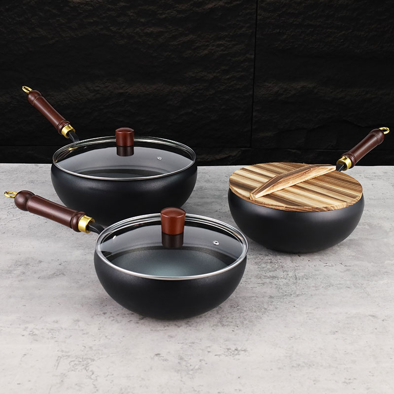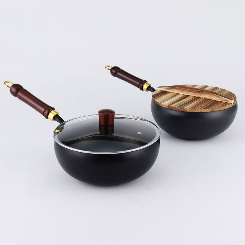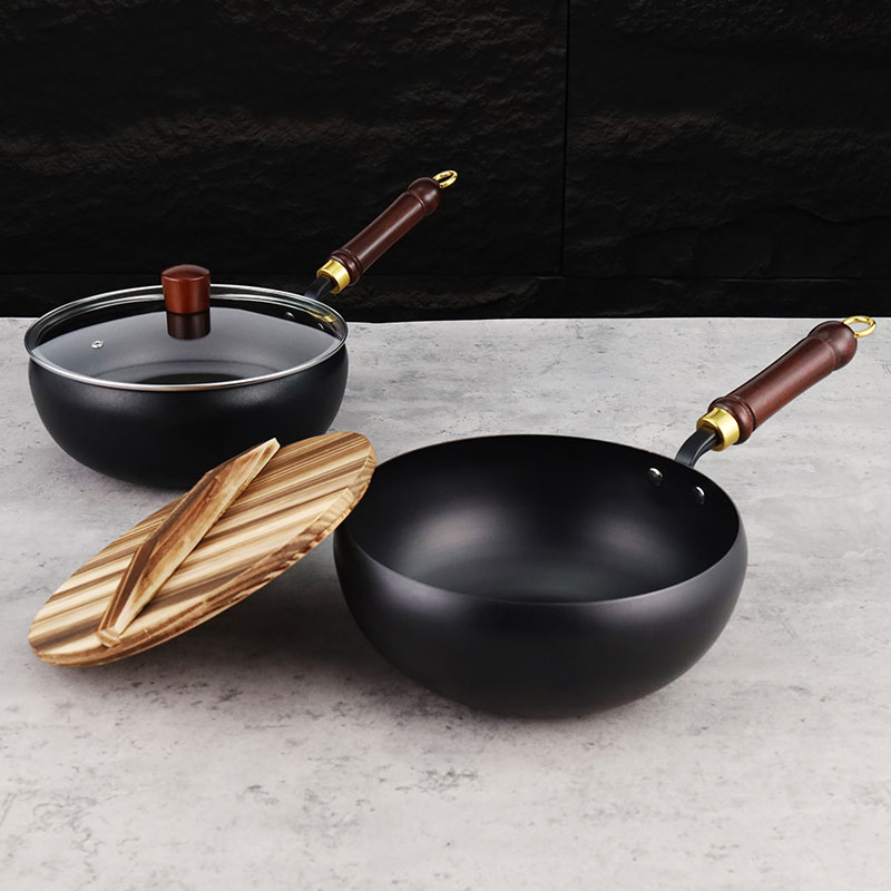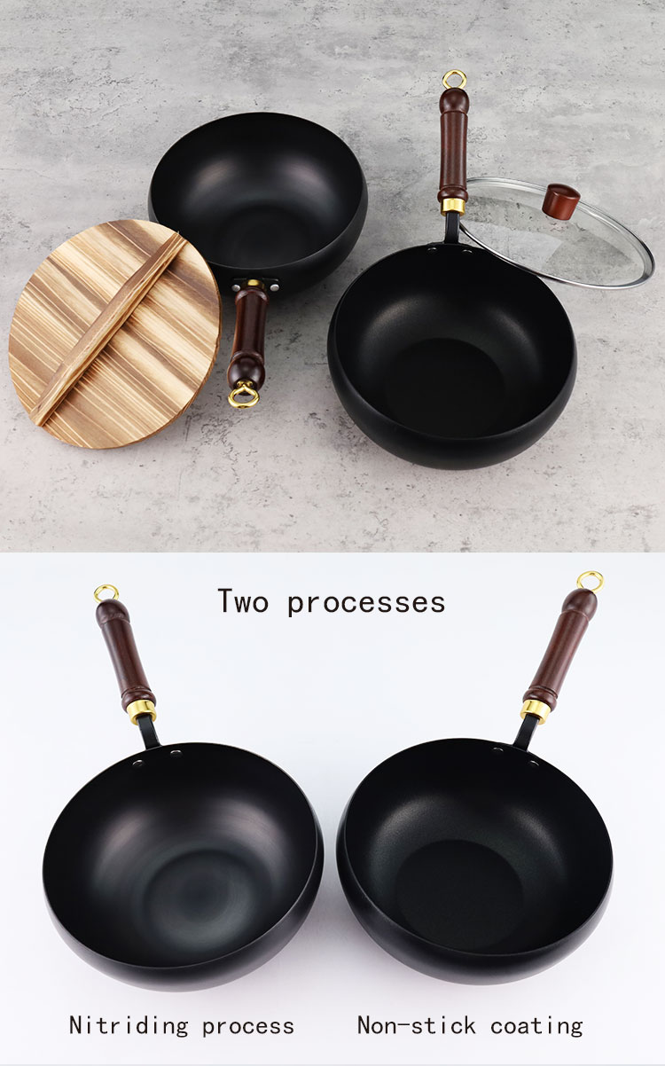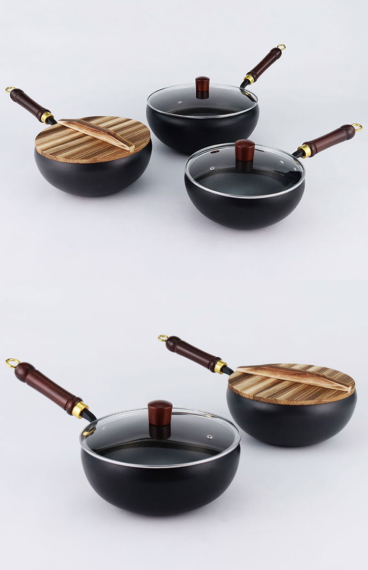 Refined iron belly pot, available in three sizes of 22cm, 24cm, and 28cm, with two processes: non stick coating and nitriding. It comes with a solid wood handle, smooth edges on the pot body, and is compatible with gas stoves and induction cookers. The bottom is flat and comes with two options: glass cover and wooden cover