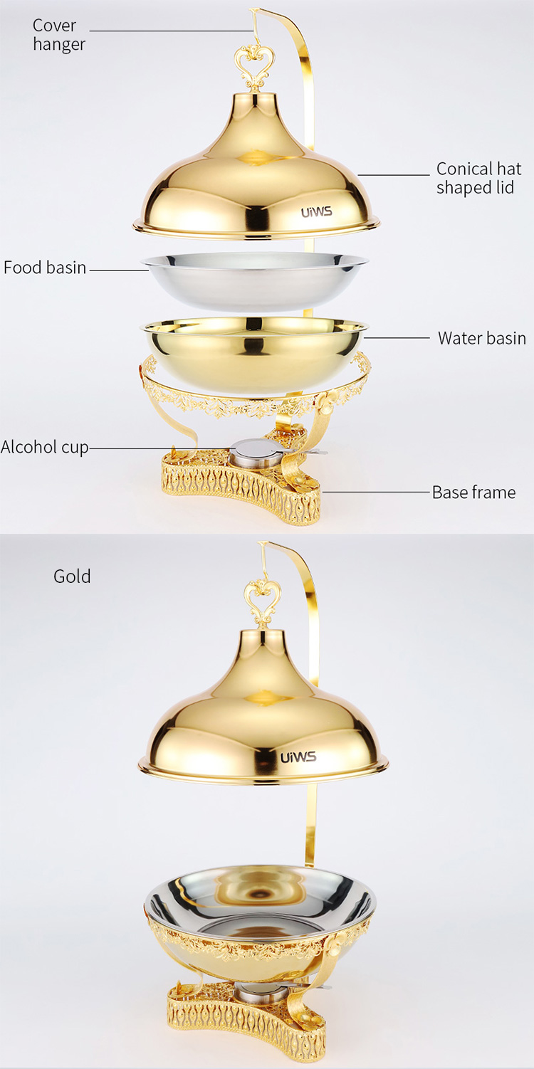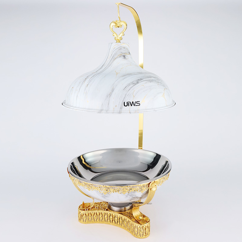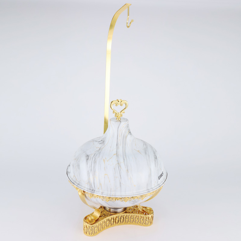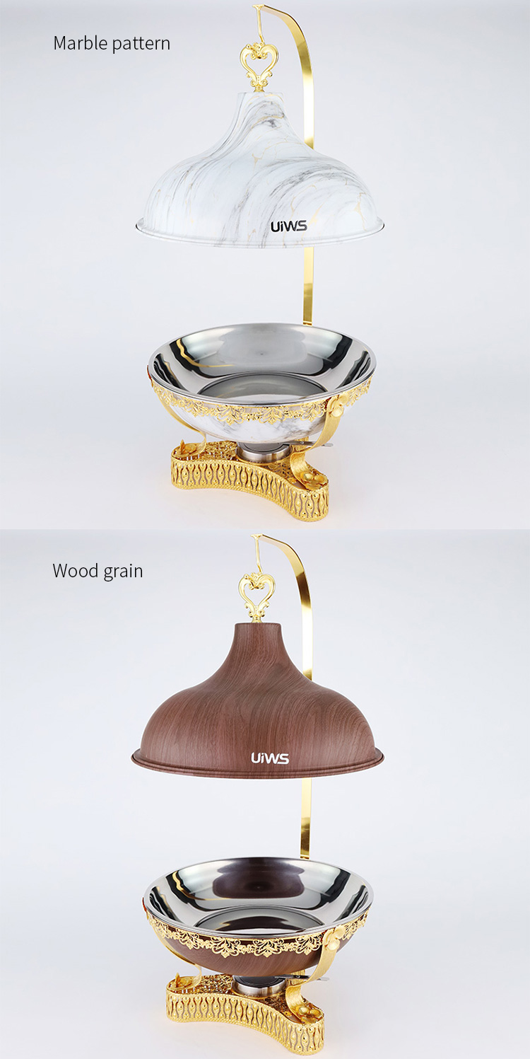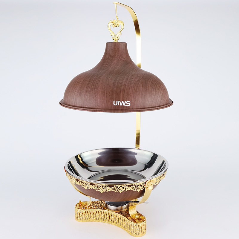 Conical hat-style hanging dining stove with a capacity of 8L, made of stainless steel, easy to assemble and disassemble, available in various colors and patterns such as gold, white marble pattern, and brown wood grain pattern. The stove base is equipped with an alcohol cup and comes with a hanging bracket.