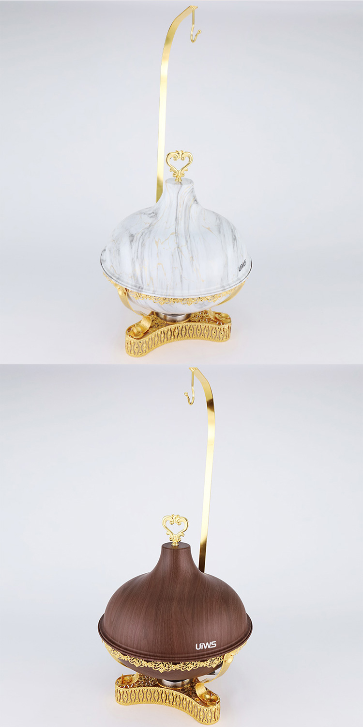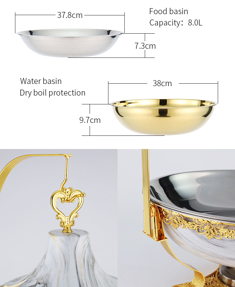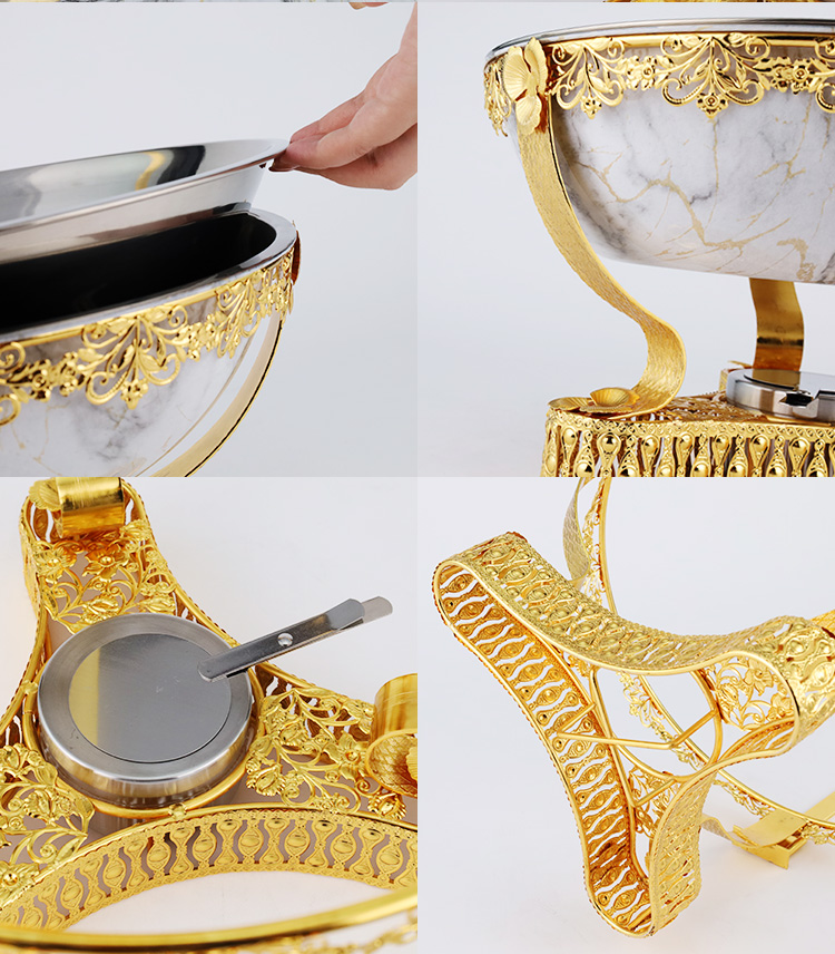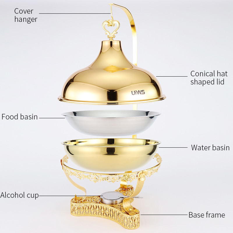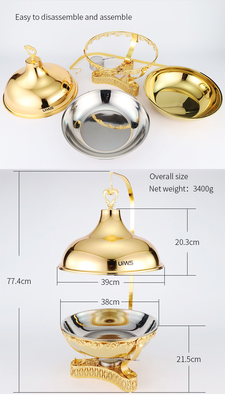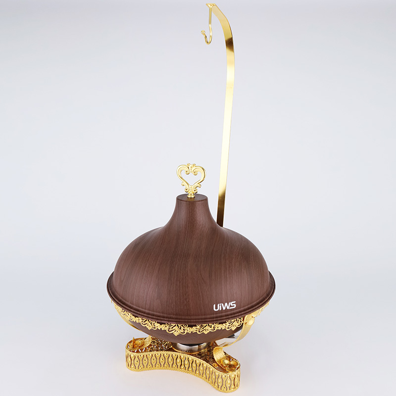 Conical hat-style hanging dining stove with a capacity of 8L, made of stainless steel, easy to assemble and disassemble, available in various colors and patterns such as gold, white marble pattern, and brown wood grain pattern. The stove base is equipped with an alcohol cup and comes with a hanging bracket.