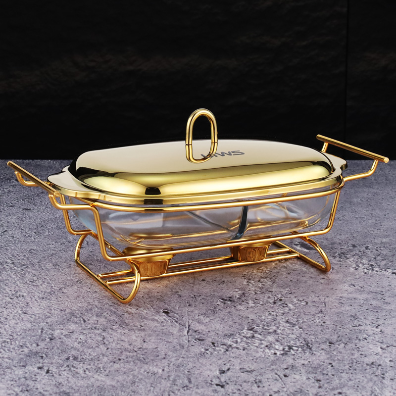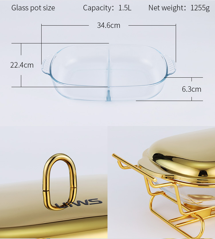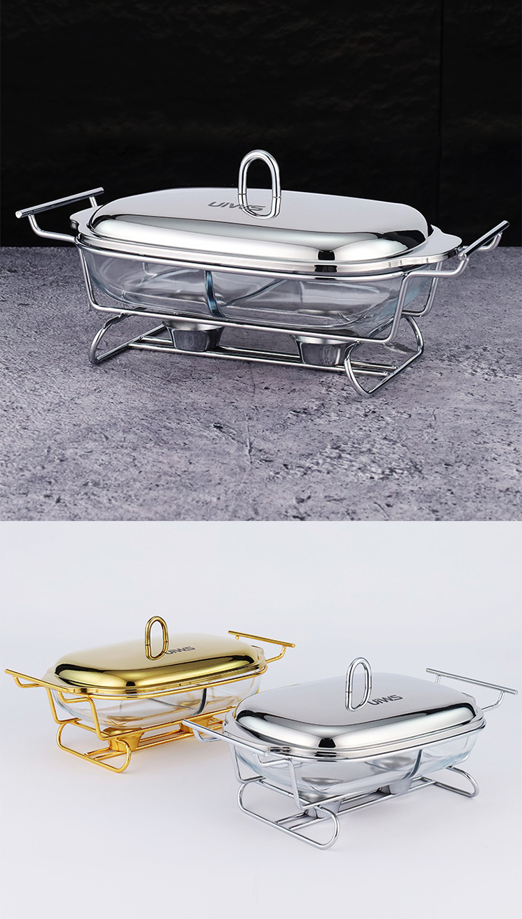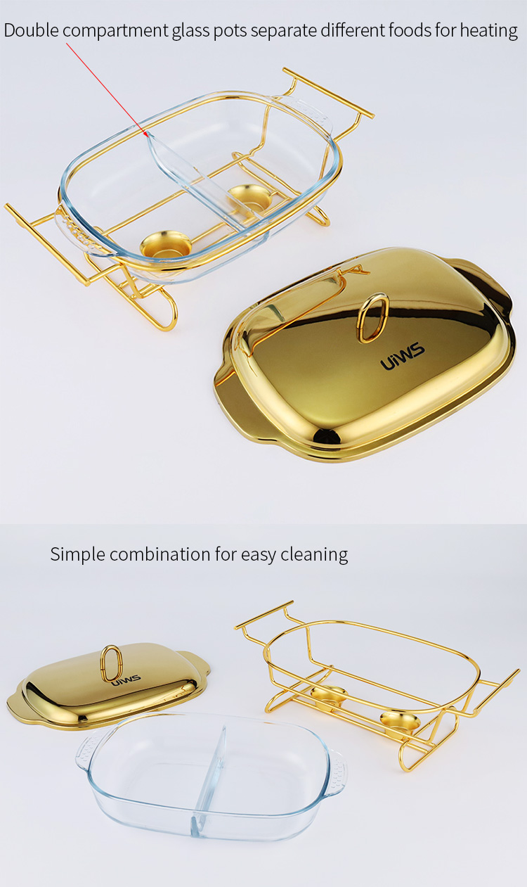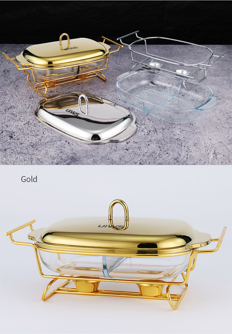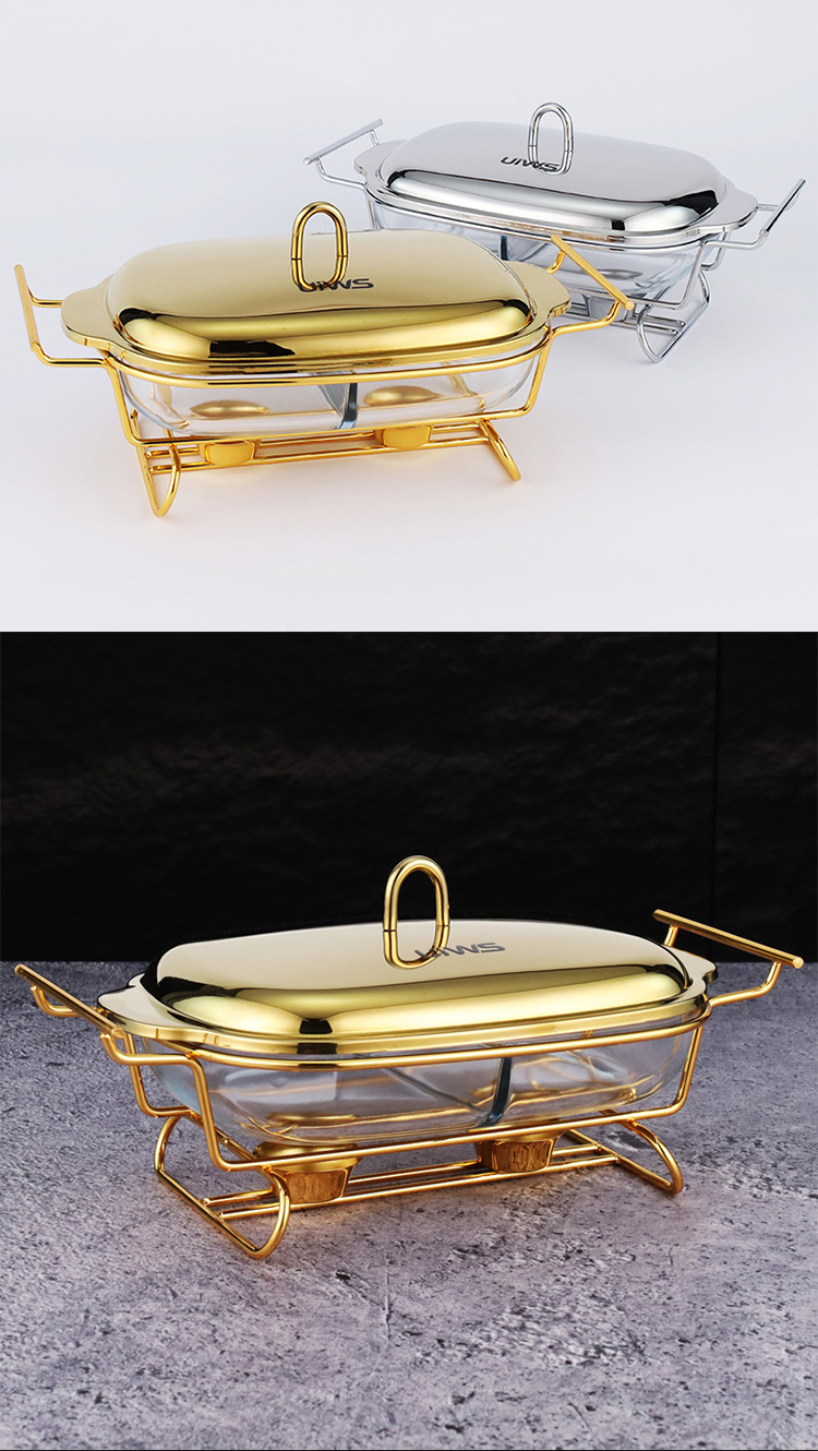 Double-layer glass chafing dish with a 1.5L capacity, composed of a stainless steel lid, glass pot, and iron stand. Easy to assemble, available in gold and silver colors. Features a U-shaped solid handle and a dual-compartment design that separates different foods for individual heating. The stand base includes an alcohol cup for stable support.