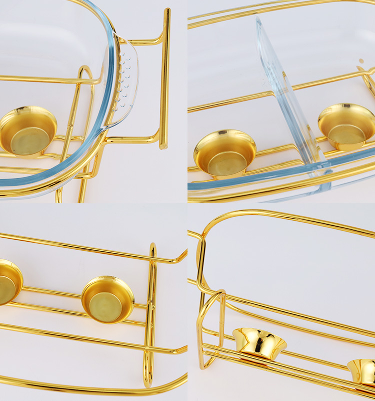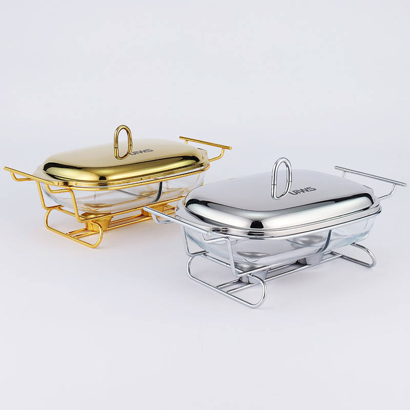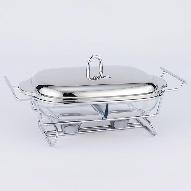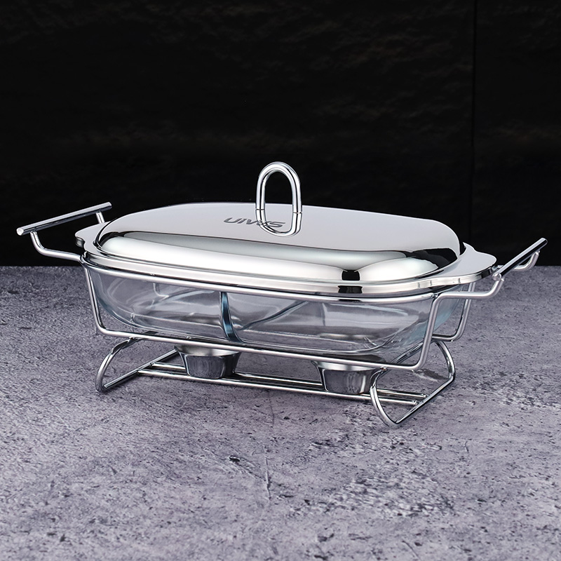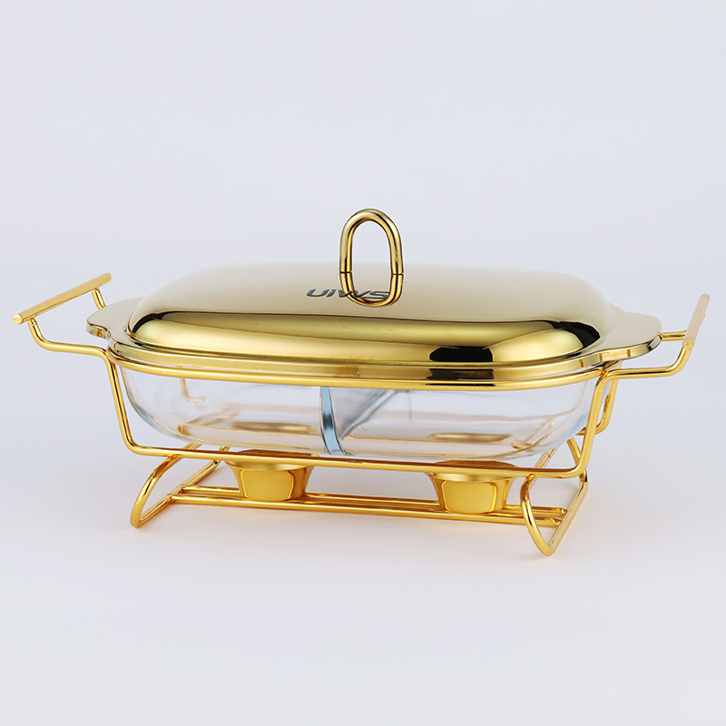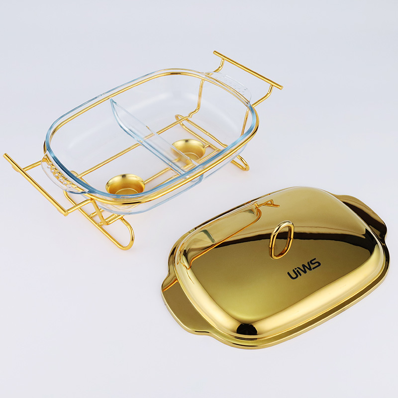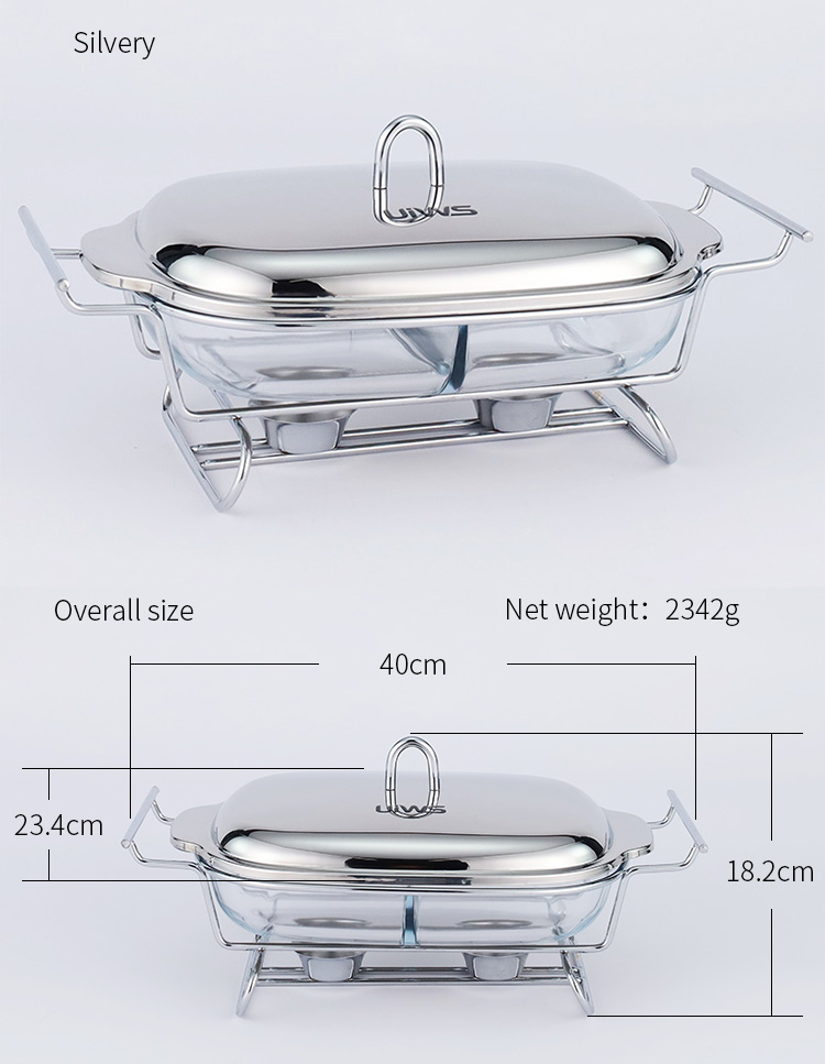 Double-layer glass chafing dish with a 1.5L capacity, composed of a stainless steel lid, glass pot, and iron stand. Easy to assemble, available in gold and silver colors. Features a U-shaped solid handle and a dual-compartment design that separates different foods for individual heating. The stand base includes an alcohol cup for stable support.