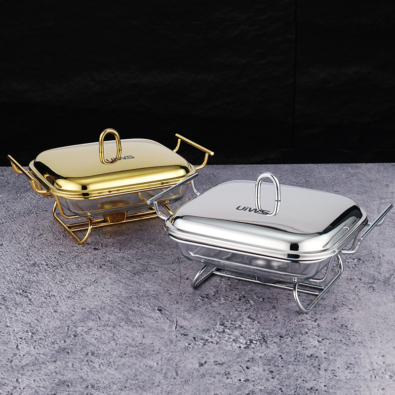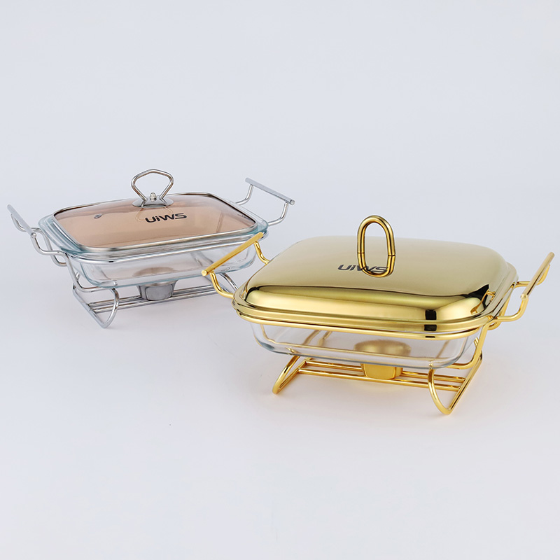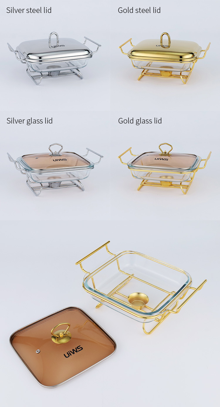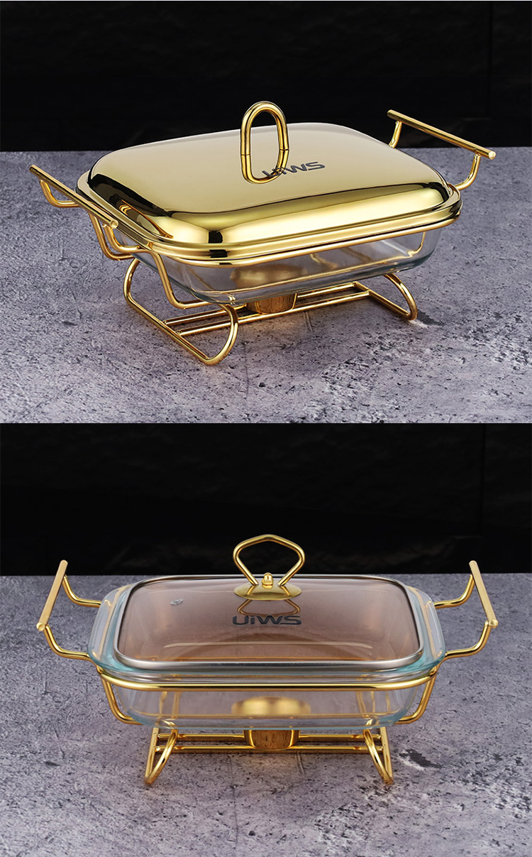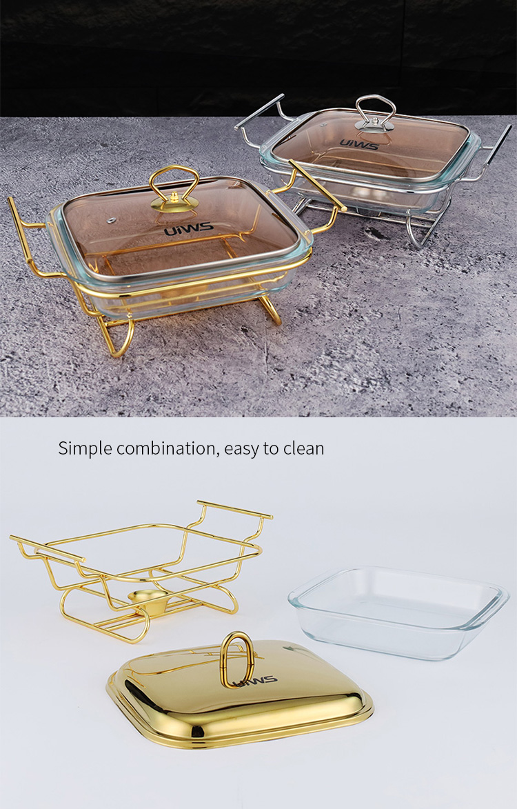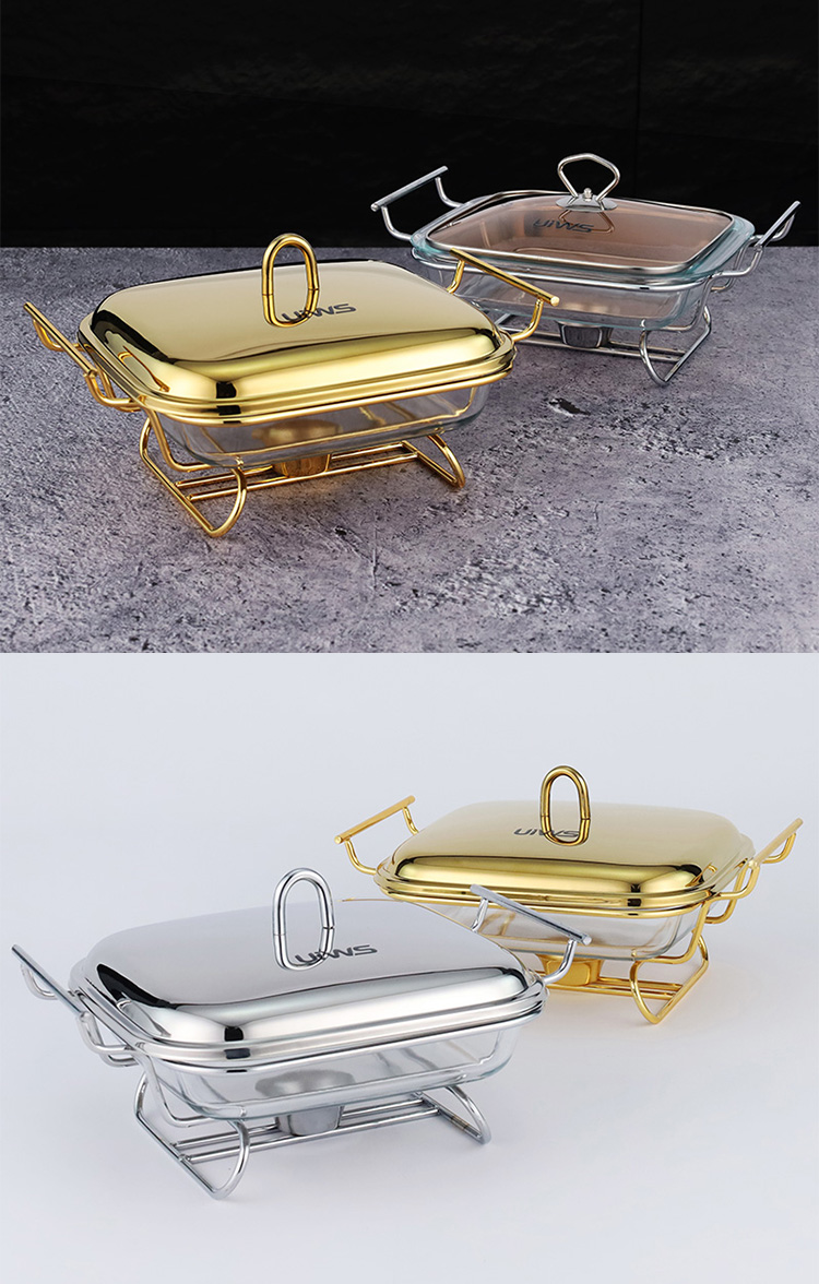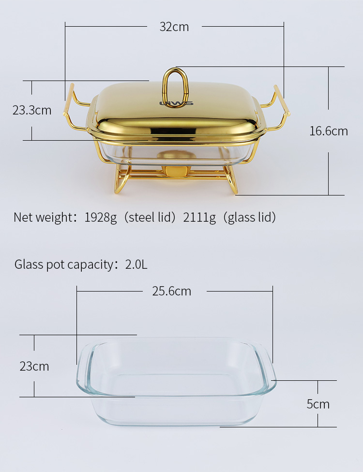 Square glass chafing dish with a capacity of 2L, available in gold and silver colors, can be equipped with either a stainless steel lid or a glass lid, offering various combinations, easy to assemble, featuring a U-shaped solid handle, square glass pot, the stand comes with an alcohol cup, sturdy and stable