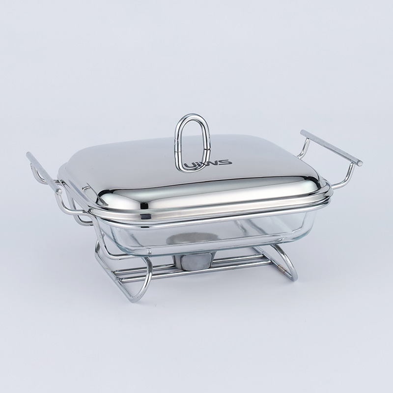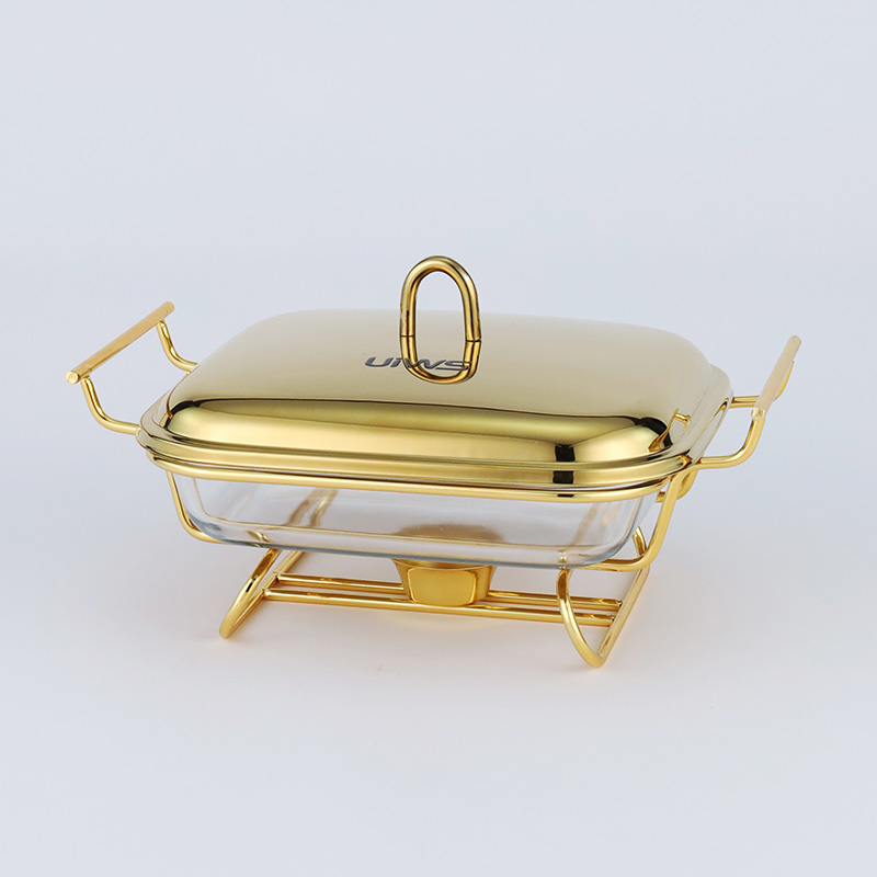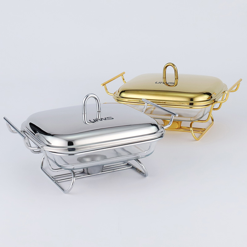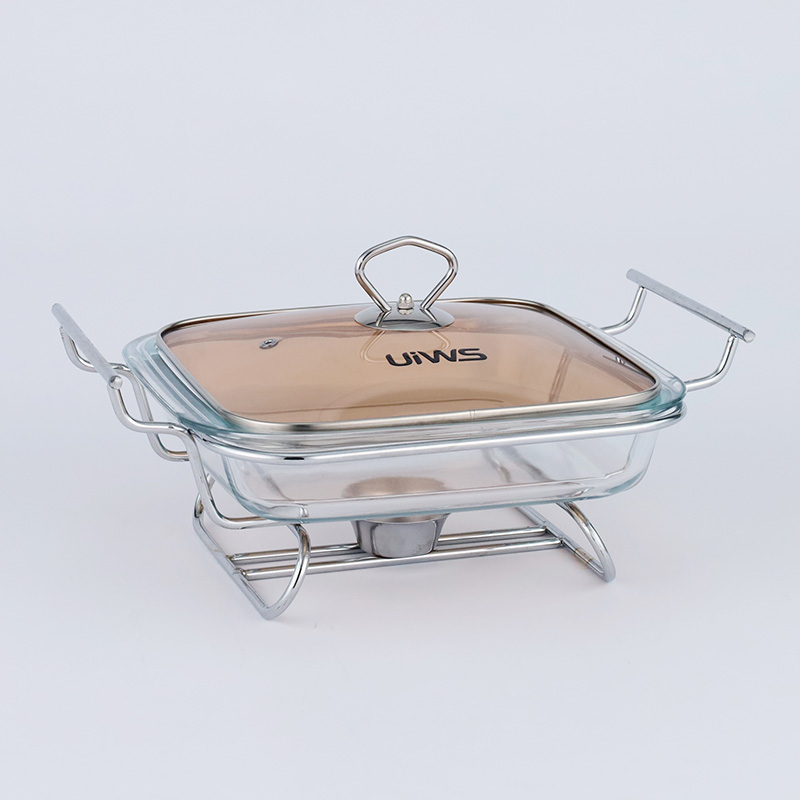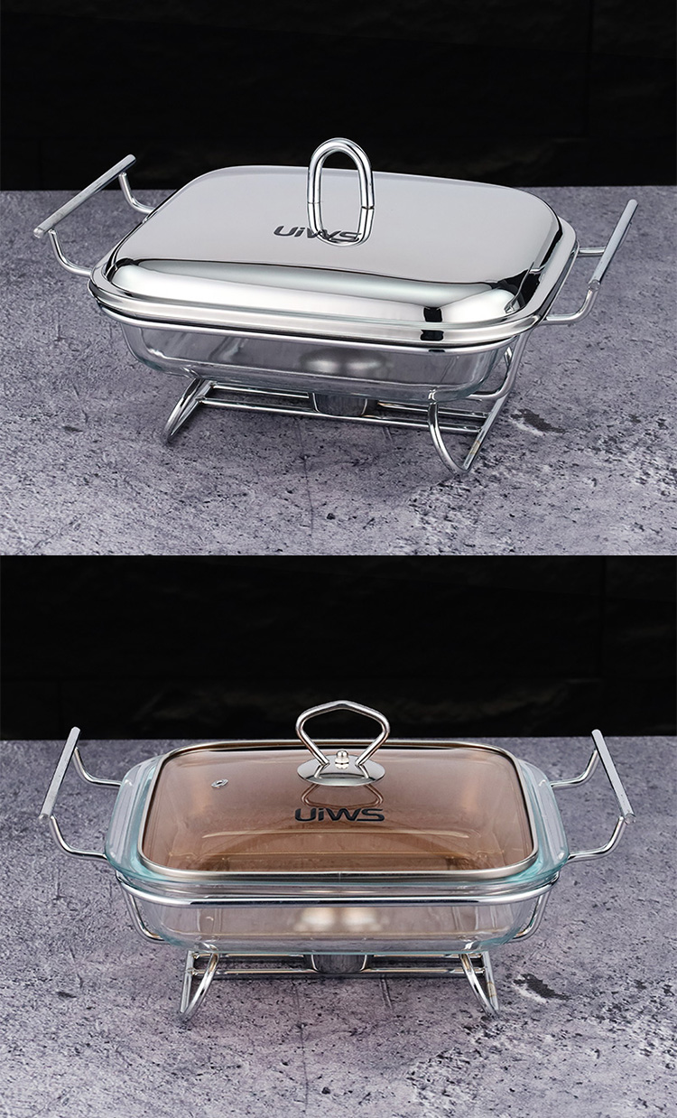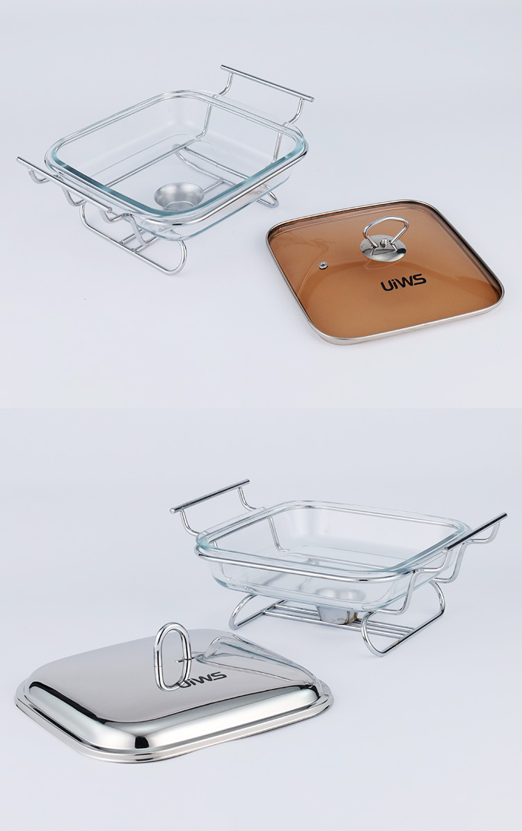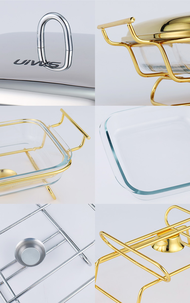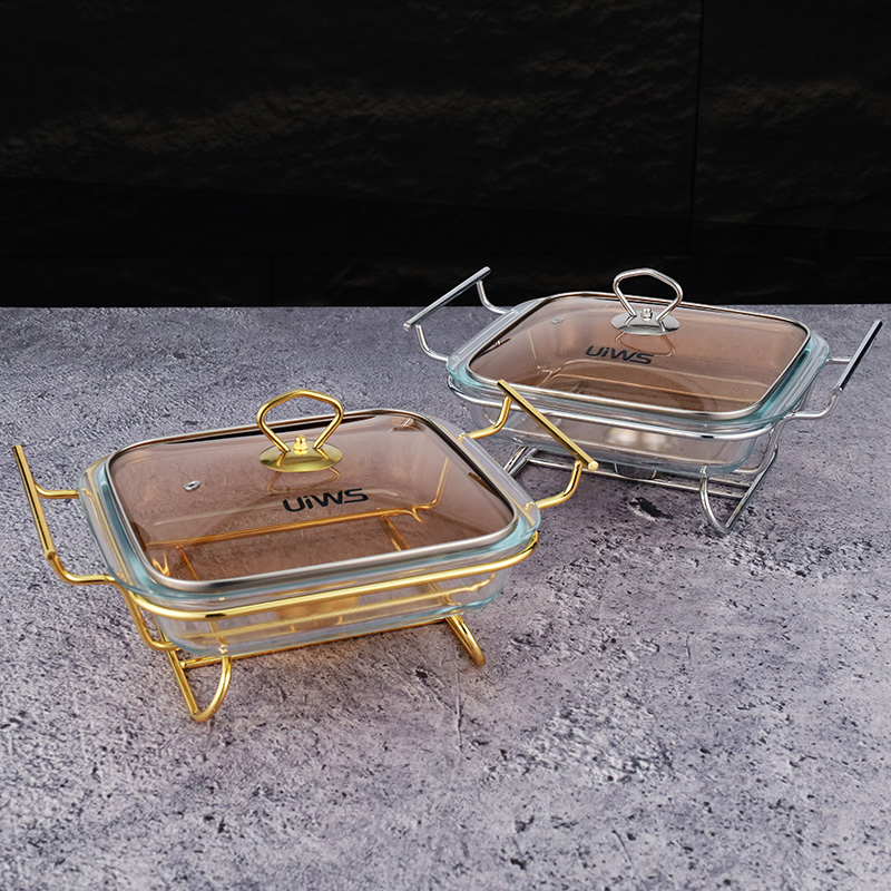 Square glass chafing dish with a capacity of 2L, available in gold and silver colors, can be equipped with either a stainless steel lid or a glass lid, offering various combinations, easy to assemble, featuring a U-shaped solid handle, square glass pot, the stand comes with an alcohol cup, sturdy and stable