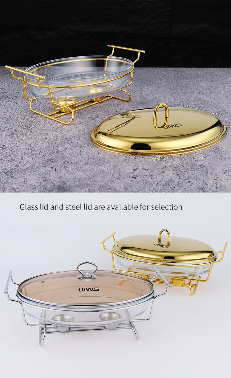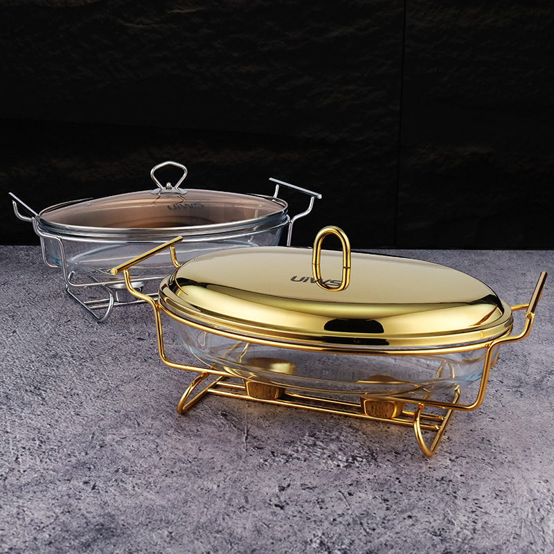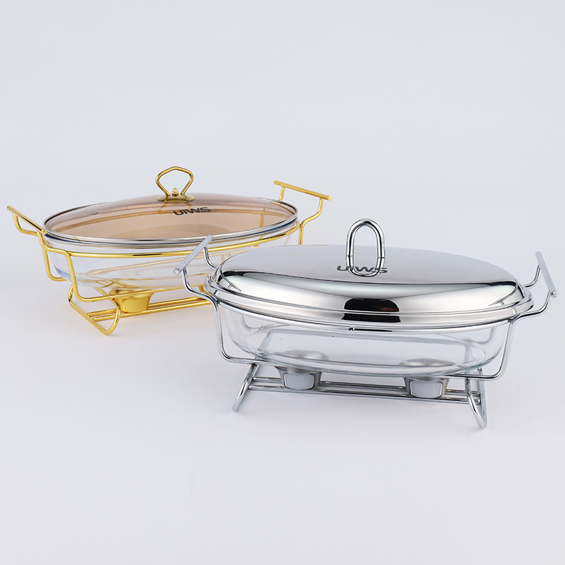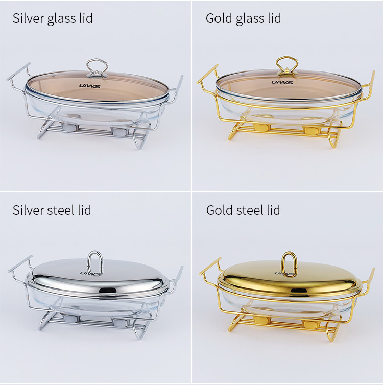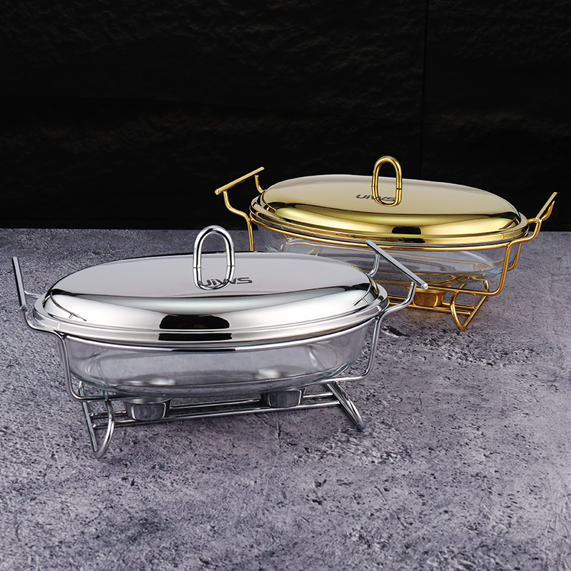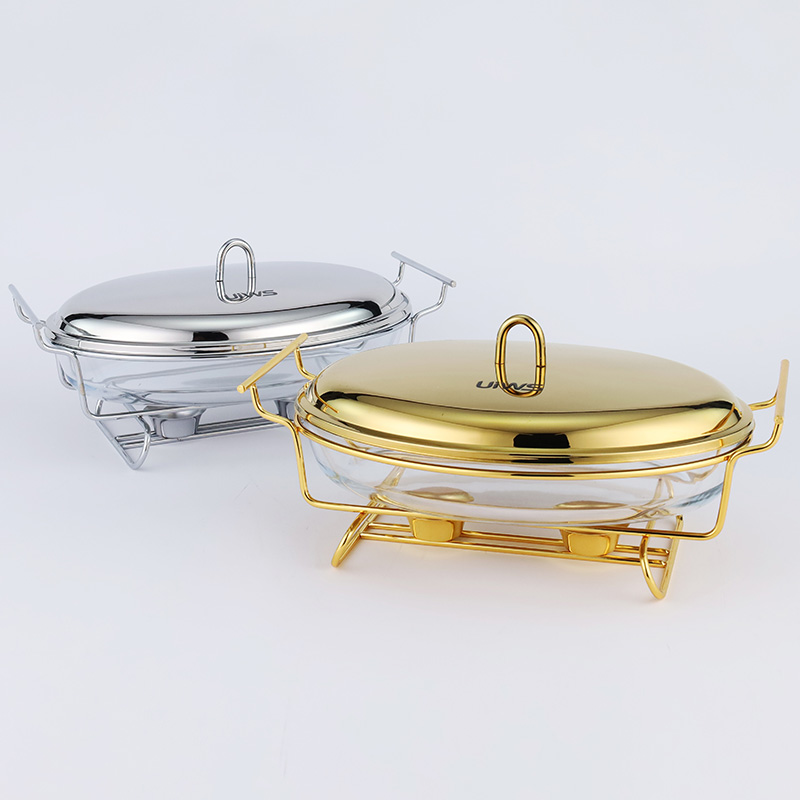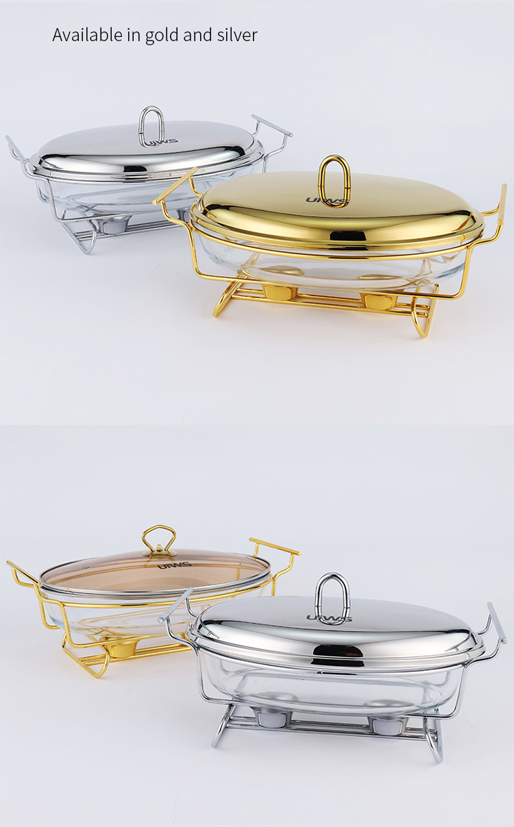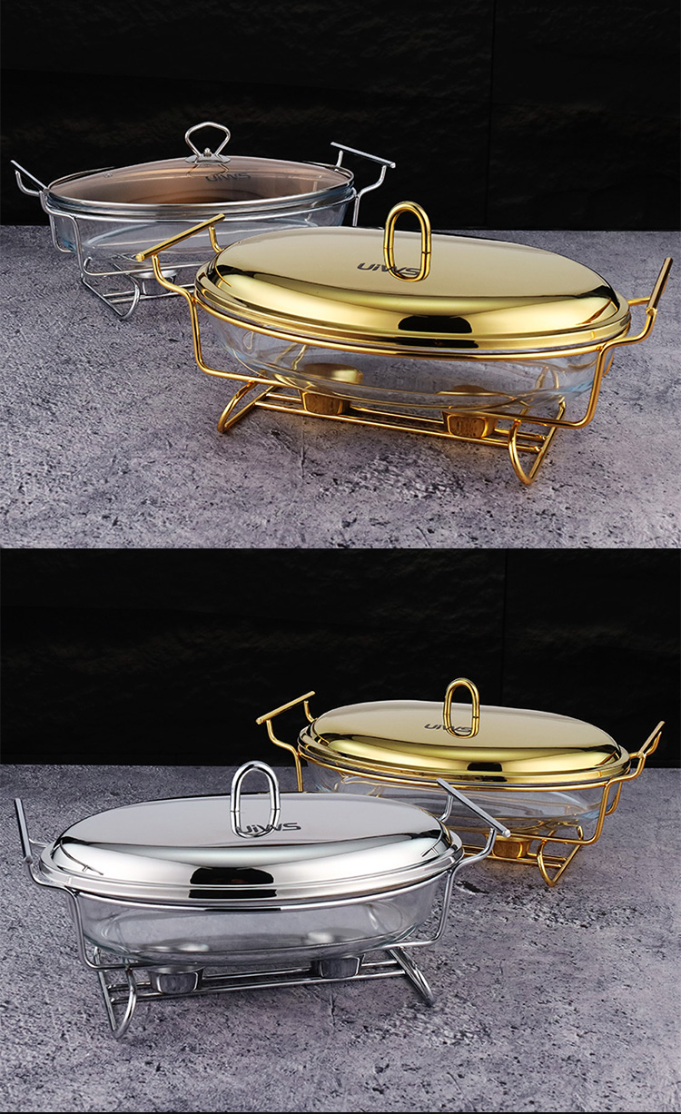 Elliptical glass chafing dish available in 2L and 3L capacities, with golden and silver color options. Lids are available in glass or steel. The oval glass pot is easy to clean, simple to assemble, and comes with a stand featuring an alcohol cup and a stable base.