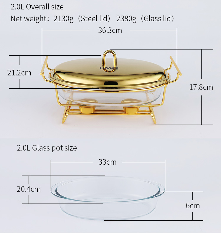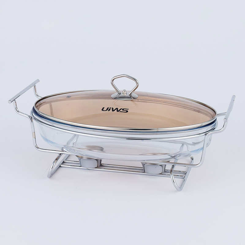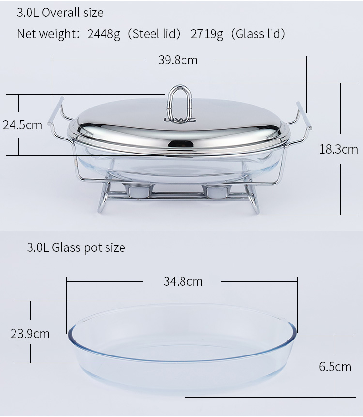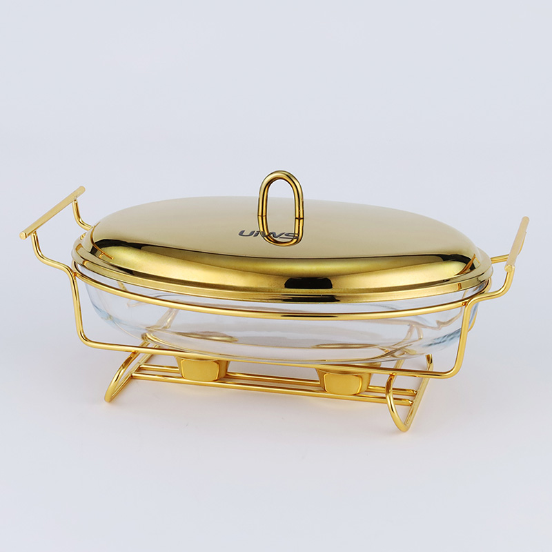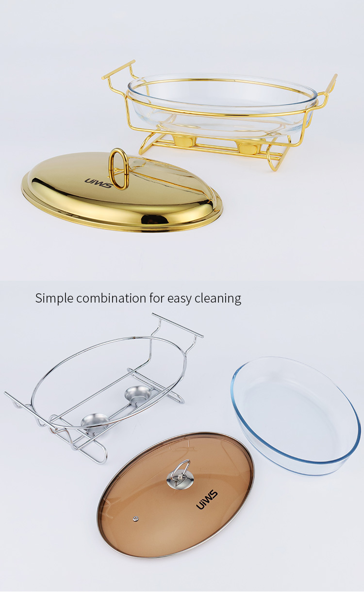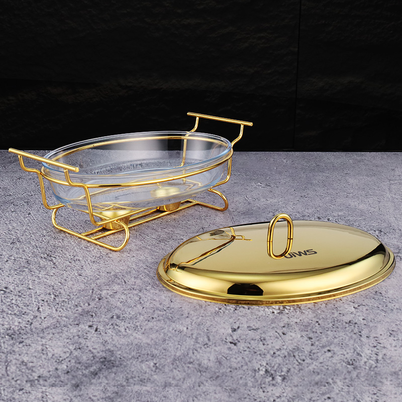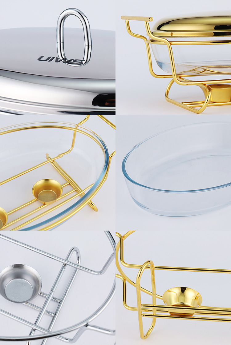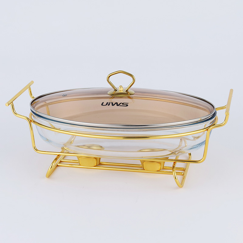 Elliptical glass chafing dish available in 2L and 3L capacities, with golden and silver color options. Lids are available in glass or steel. The oval glass pot is easy to clean, simple to assemble, and comes with a stand featuring an alcohol cup and a stable base.
