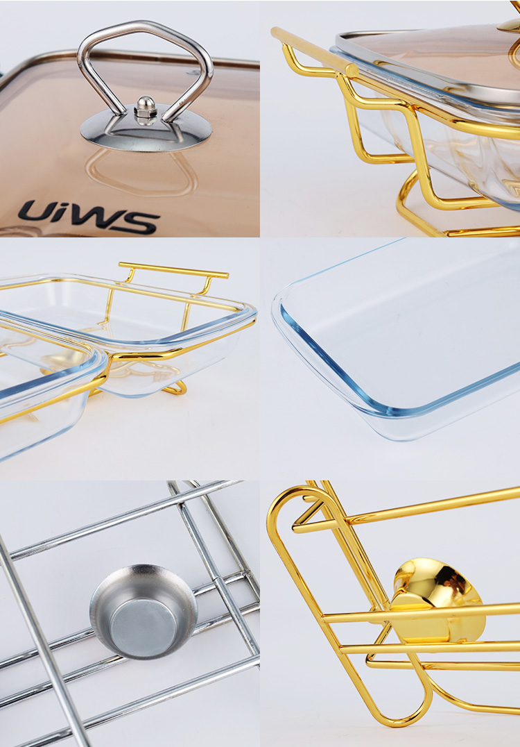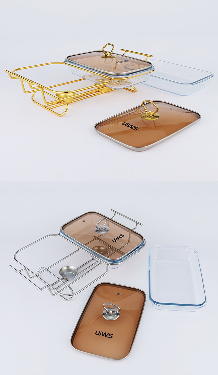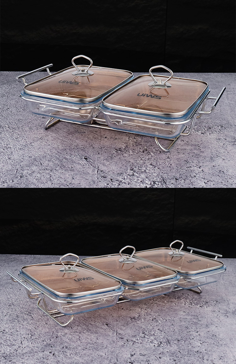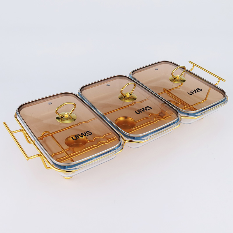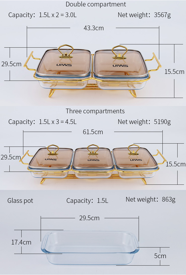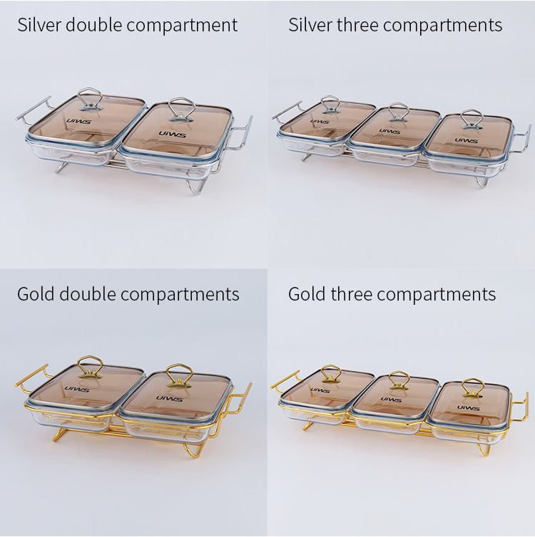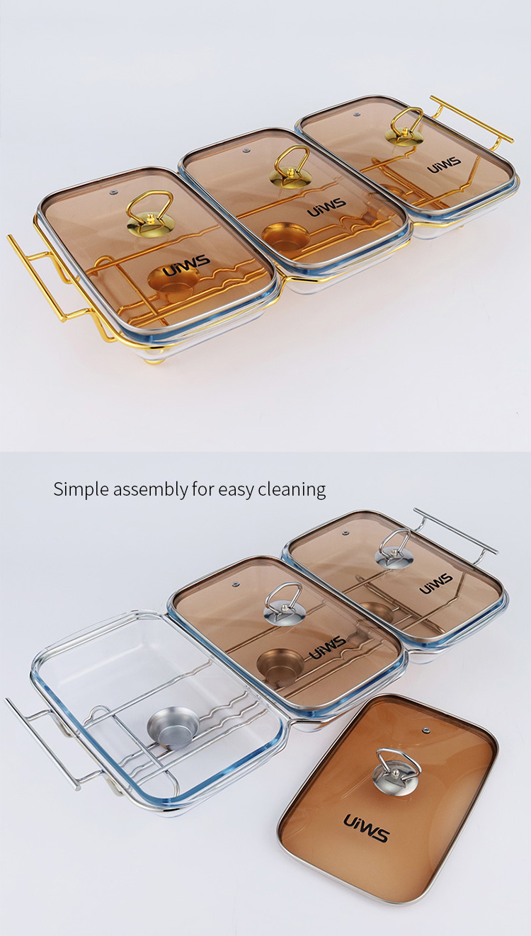Double or triple compartments glass chafing dish, composed of a glass pot, glass lid, and stand, easy to assemble, available in gold and silver colors, with a sturdy and stable stand that includes an alcohol cup. The double warmer has a capacity of 3L, while the triple warmer has a capacity of 4.5L. The glass lid features a handle for easy handling and convenient cleaning.