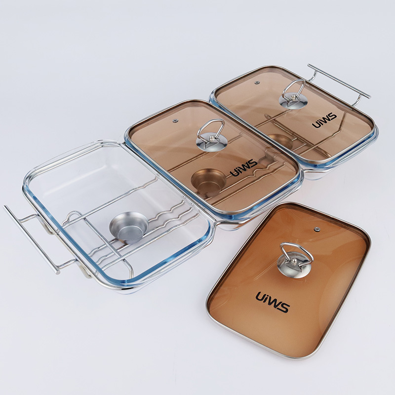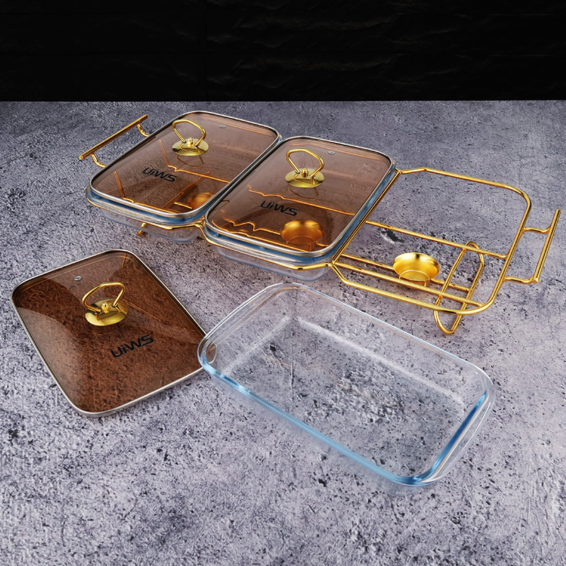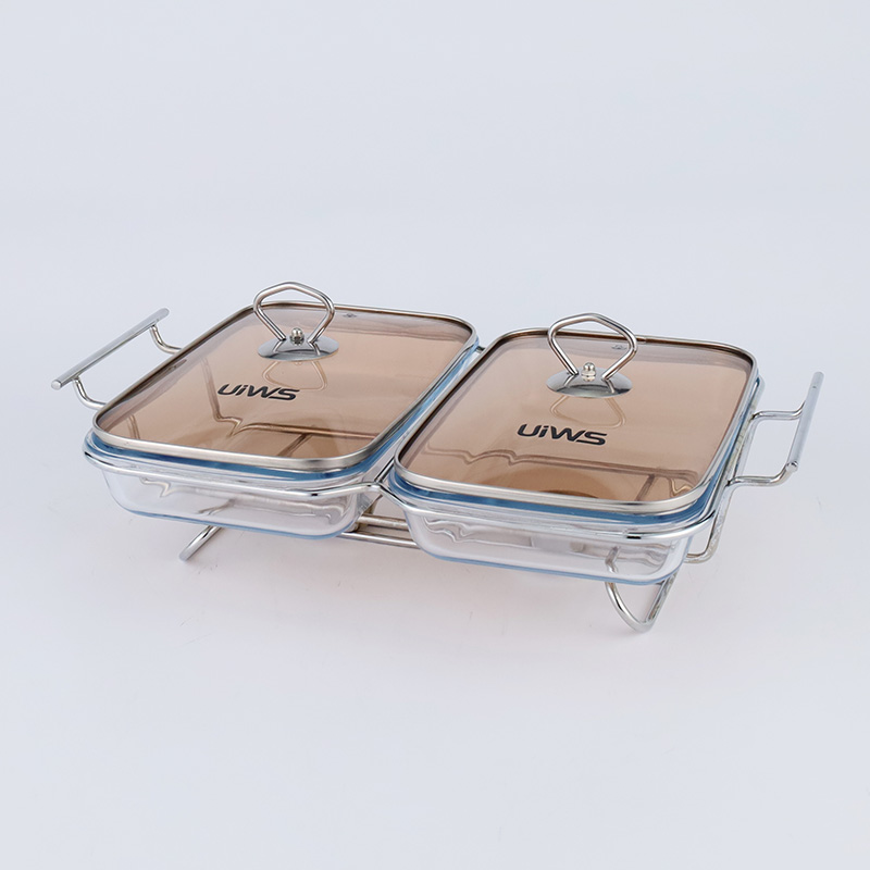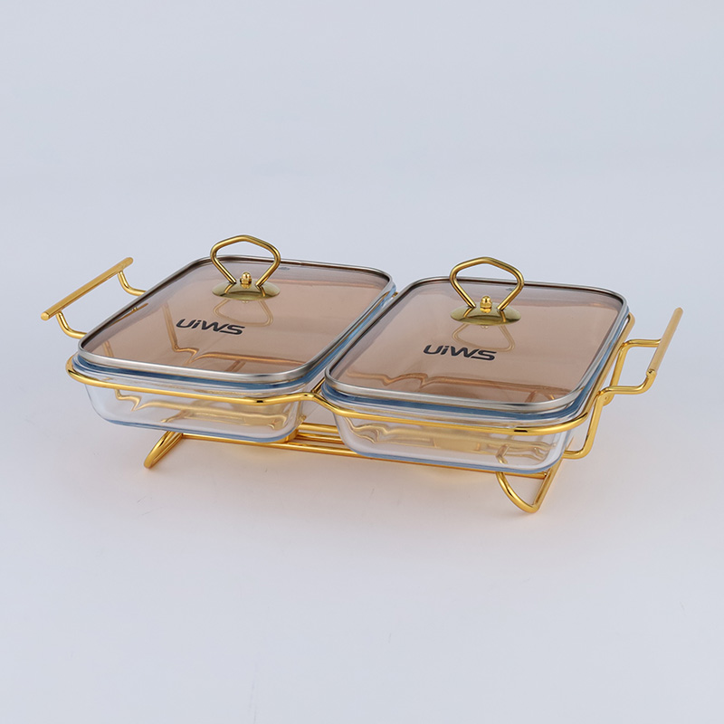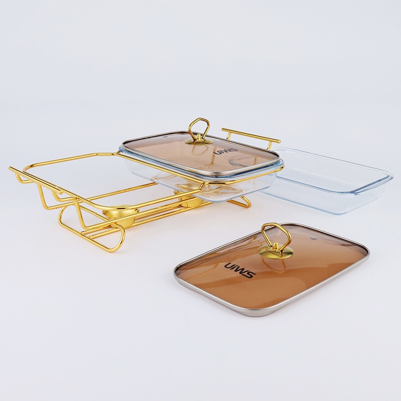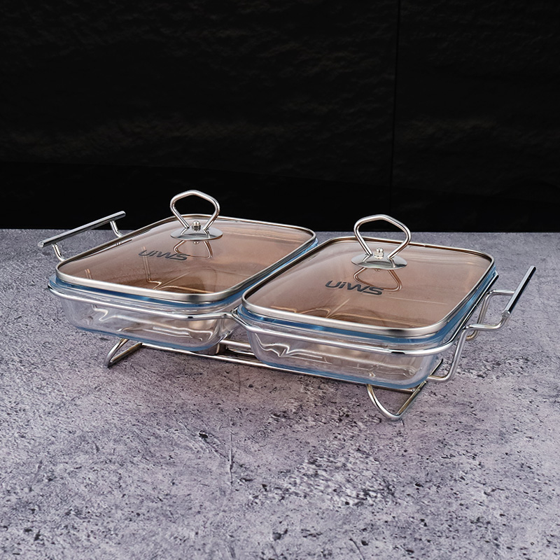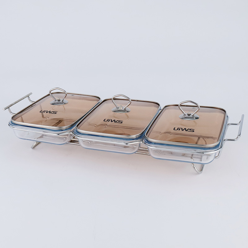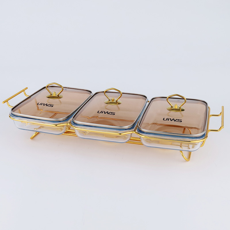Double or triple compartments glass chafing dish, composed of a glass pot, glass lid, and stand, easy to assemble, available in gold and silver colors, with a sturdy and stable stand that includes an alcohol cup. The double warmer has a capacity of 3L, while the triple warmer has a capacity of 4.5L. The glass lid features a handle for easy handling and convenient cleaning.